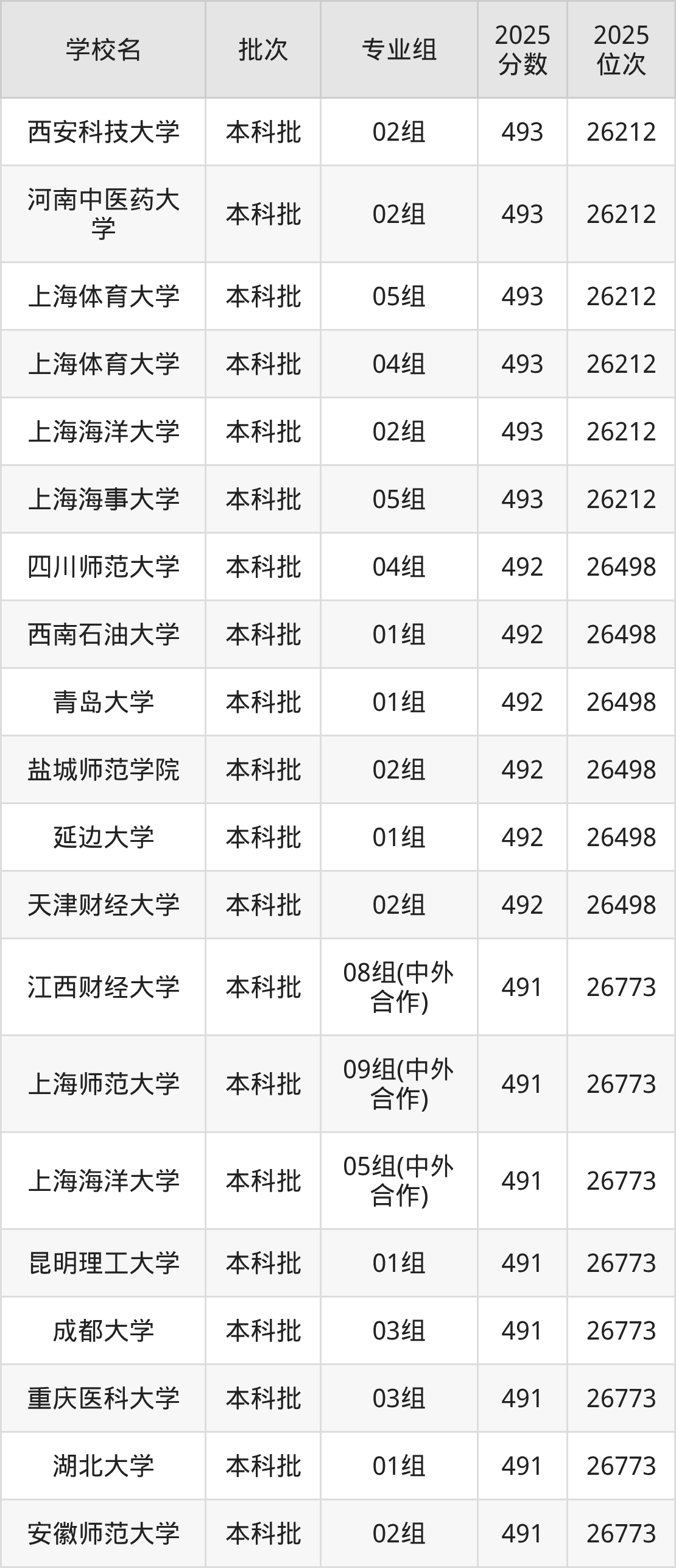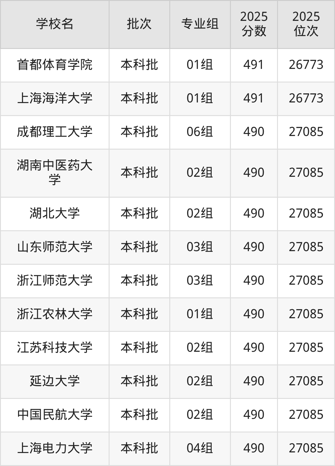 2025年上海高考491分(26499名~26773名)能上的大学有上海海洋大学01组、首都体育学院01组、安徽师范大学02组、湖北大学01组等。