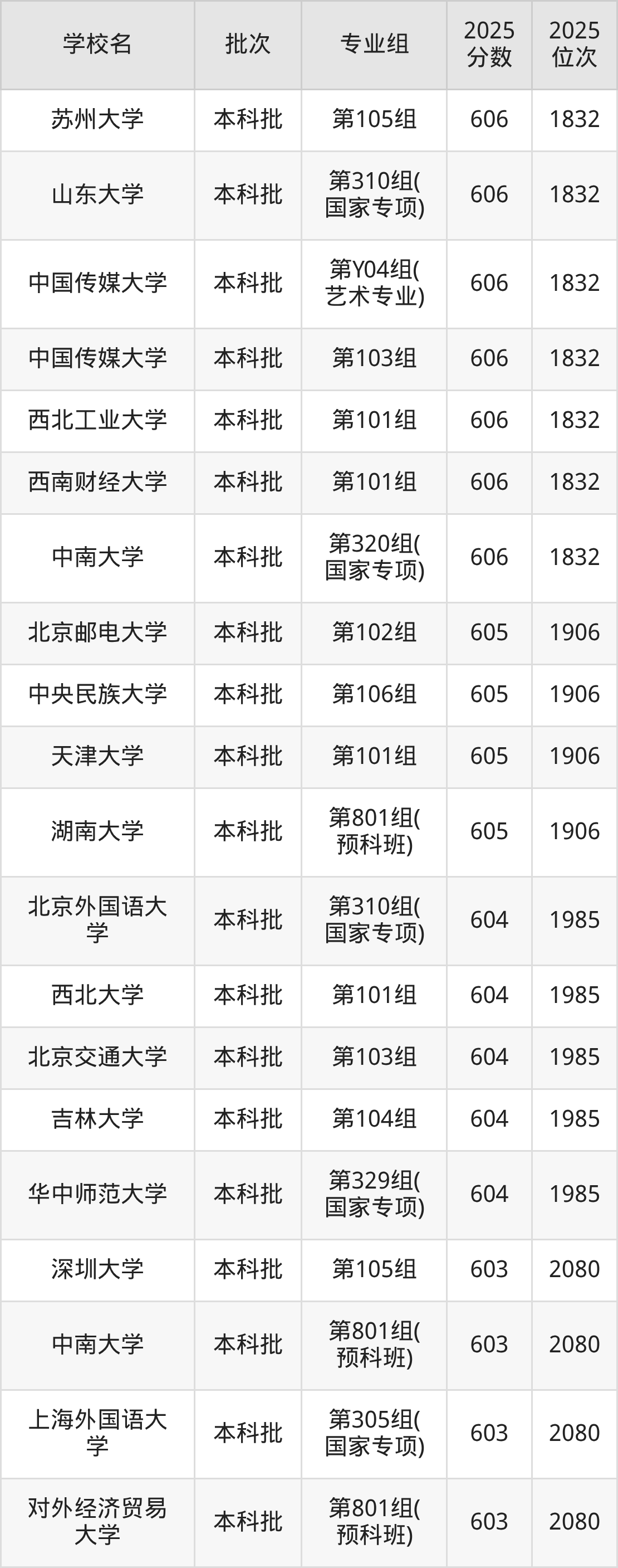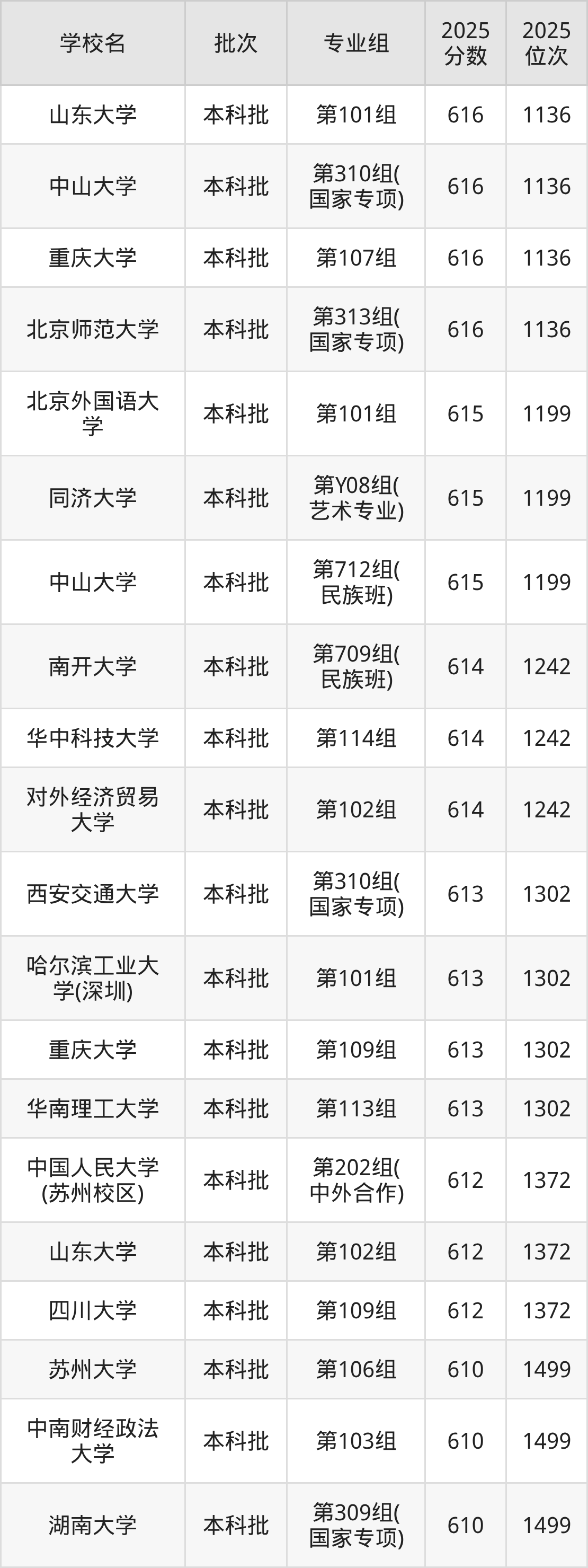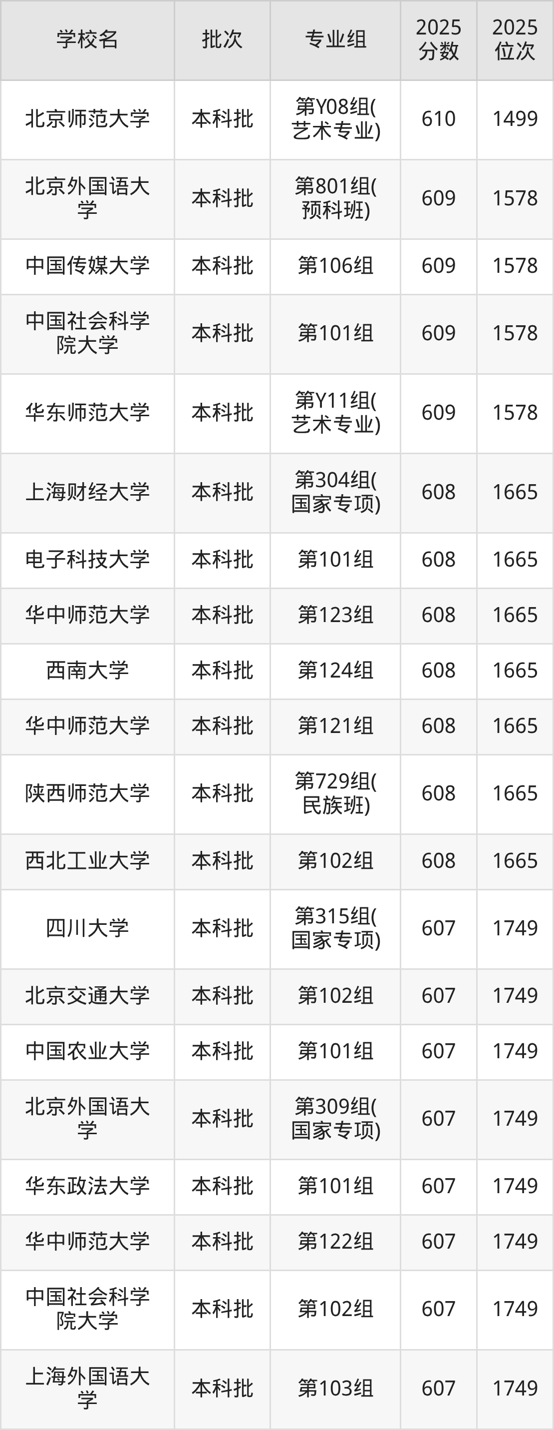 2025年湖南高考历史类608分(1579名~1665名)能上的大学有上海财经大学第304组(国家专项)、华中师范大学第121组、华中师范大学第123组、西南大学第124组等。