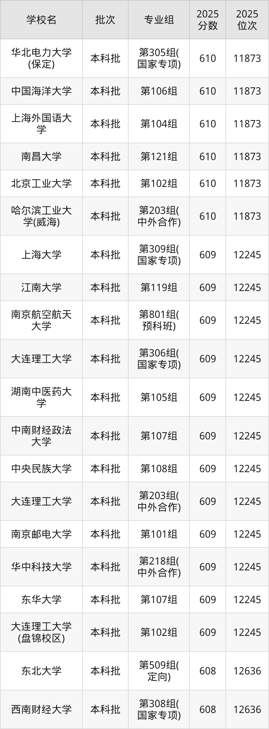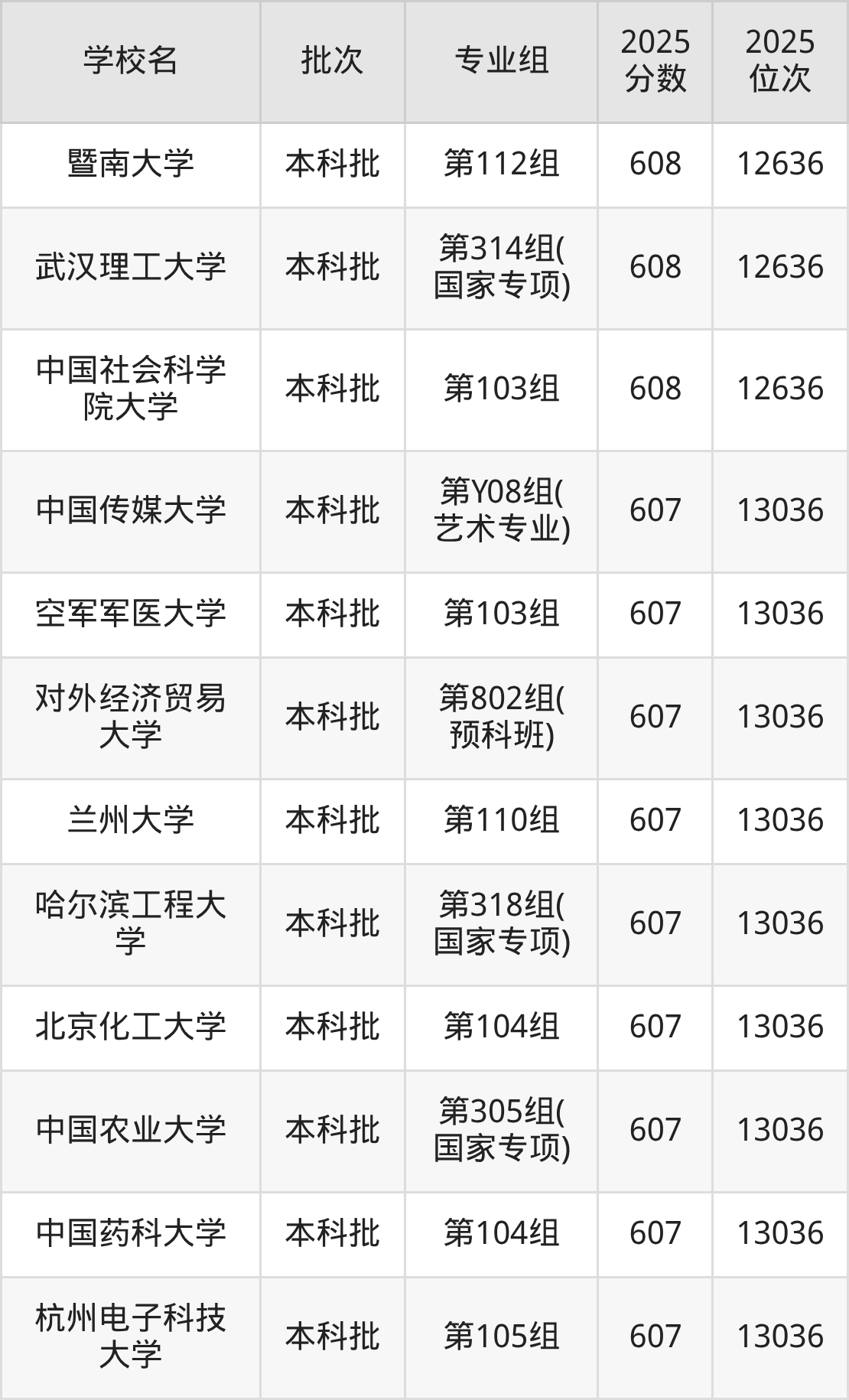 2025年湖南高考物理类608分(12246名~12636名)能上的大学有中国社会科学院大学第103组、东北大学第509组(定向)、武汉理工大学第314组(国家专项)、暨南大学第112组等。