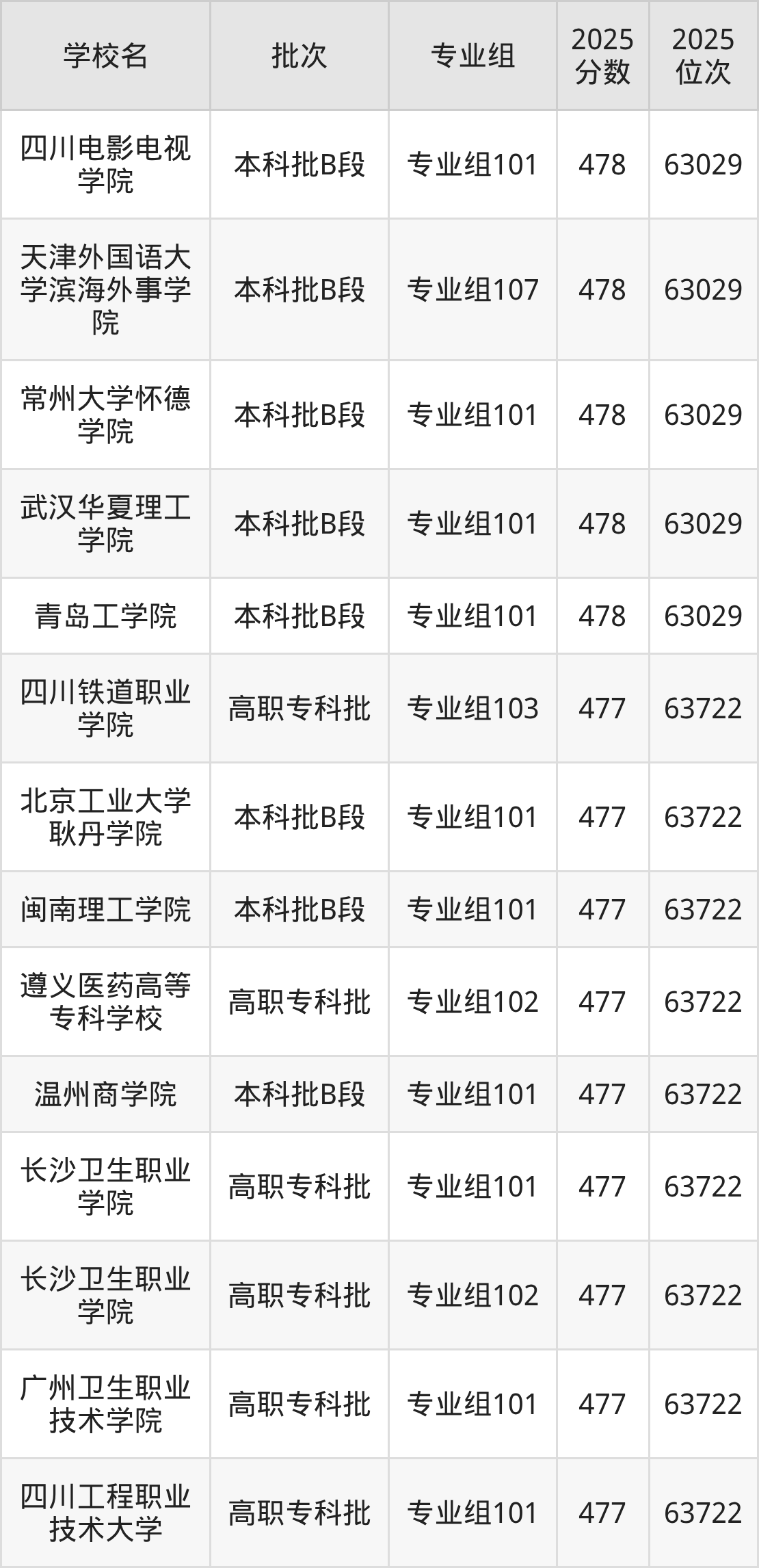 2025年四川高考历史类477分(63030名~63722名)能上的大学有长沙卫生职业学院专业组101、温州商学院专业组101、遵义医药高等专科学校专业组102、闽南理工学院专业组101等。