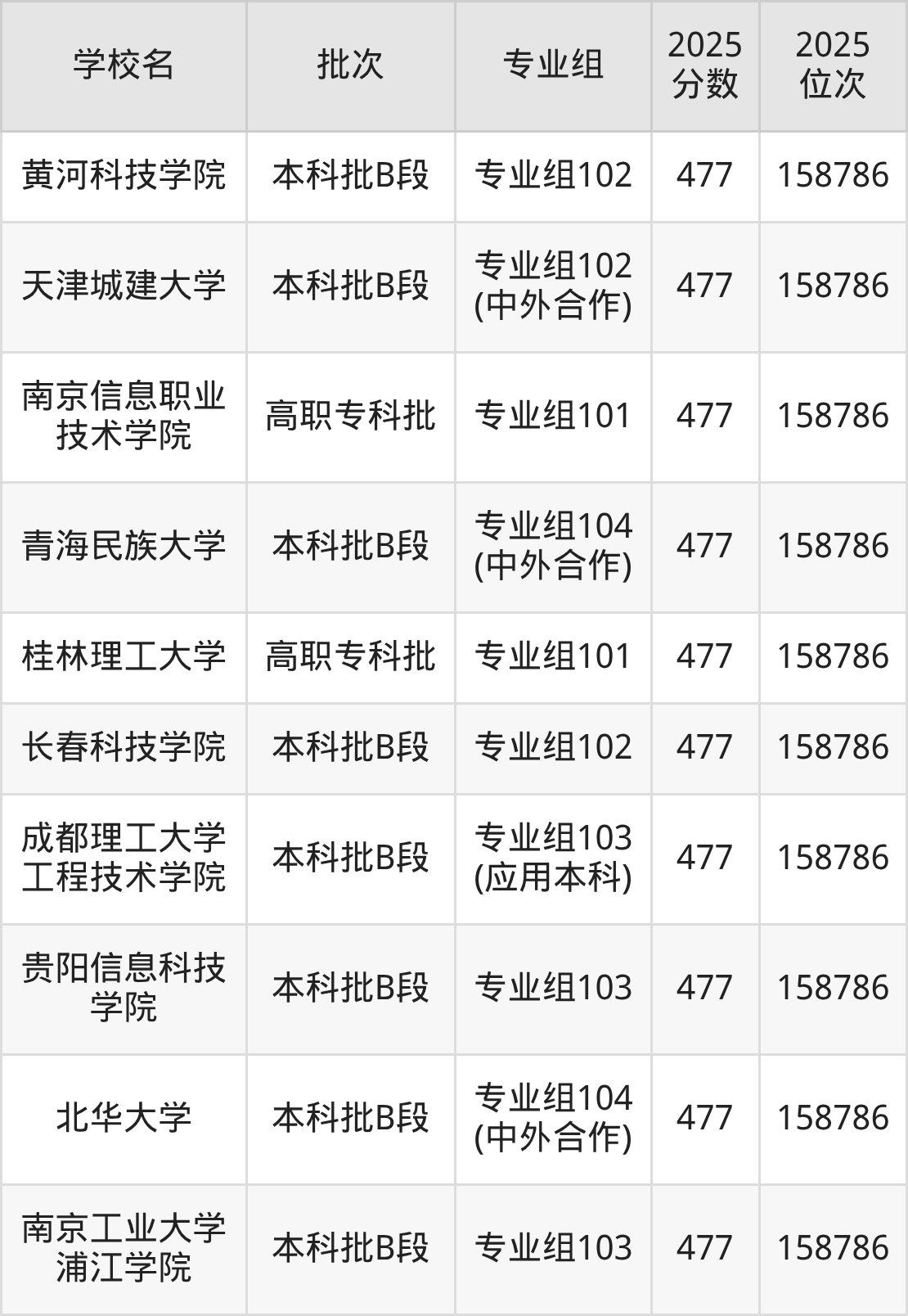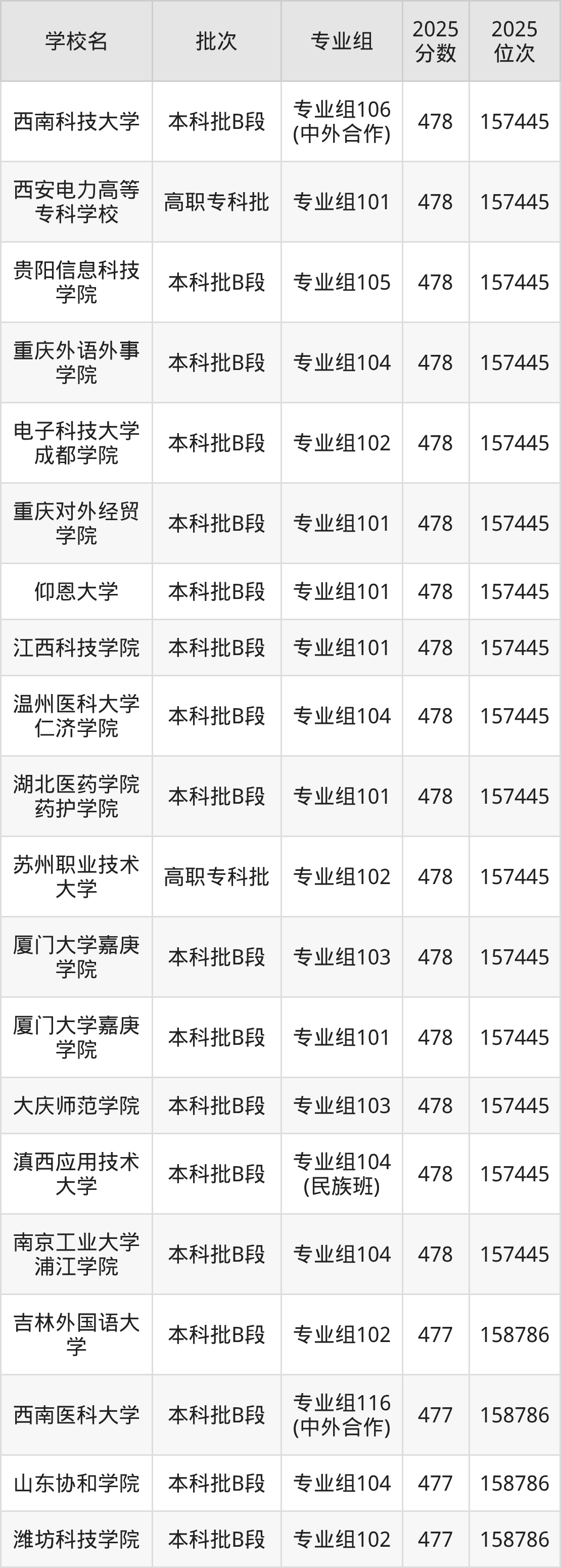 另外录取位次低于该区间(较稳妥)的有华北理工大学专业组102(160168名)、西南交通大学希望学院专业组105(160168名)等;录取位次高于该区间(可冲)的有江西科技学院专业组101(157445名)、南京工业大学浦江学院专业组104(157445名)等。