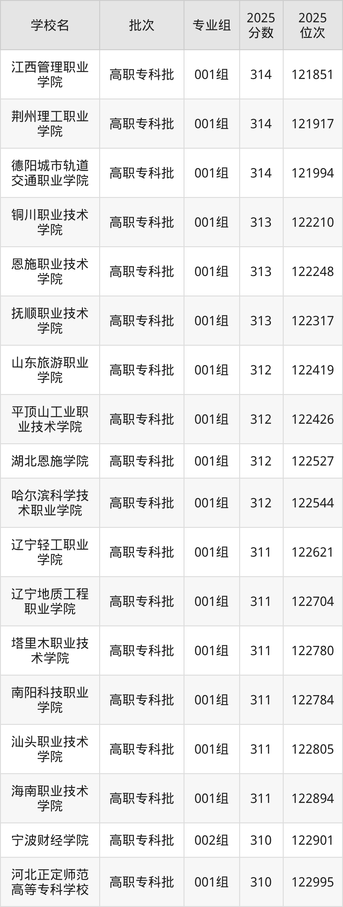 2025年安徽高考历史类312分(122333名~122602名)能上的大学有哈尔滨科学技术职业学院001组、湖北恩施学院001组、平顶山工业职业技术学院001组、山东旅游职业学院001组。