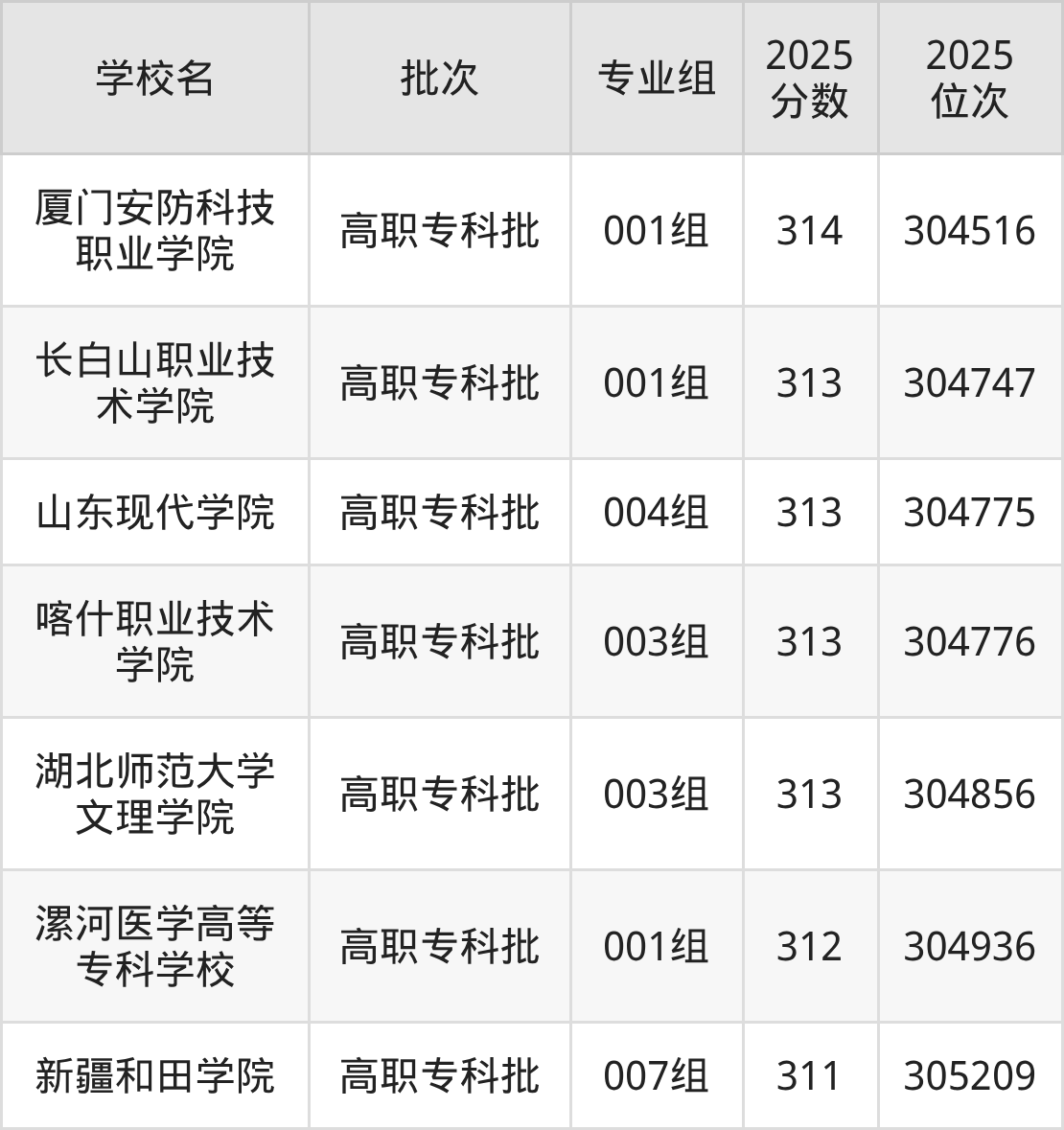 另外录取位次低于该区间(较稳妥)的有新疆和田学院007组(305209名)、潍坊食品科技职业学院001组(305709名)等;录取位次高于该区间(可冲)的有湖北师范大学文理学院003组(304856名)、喀什职业技术学院003组(304776名)等。