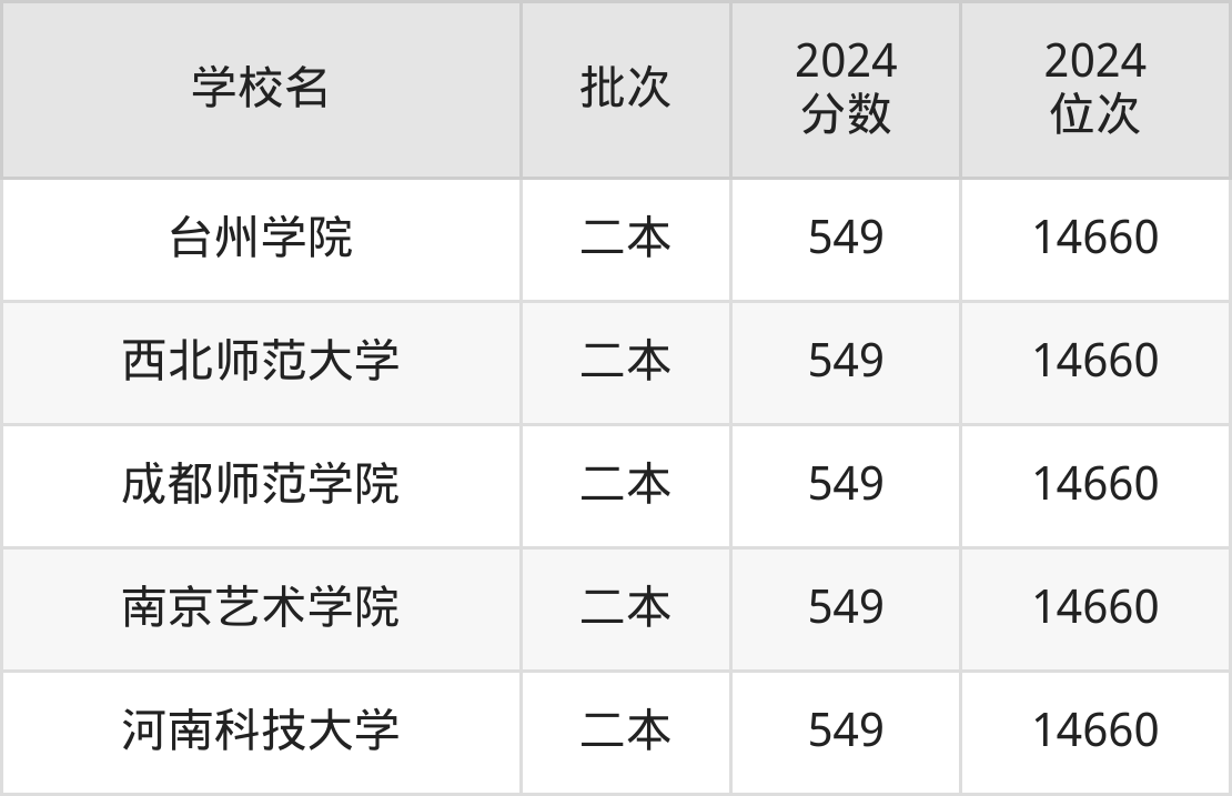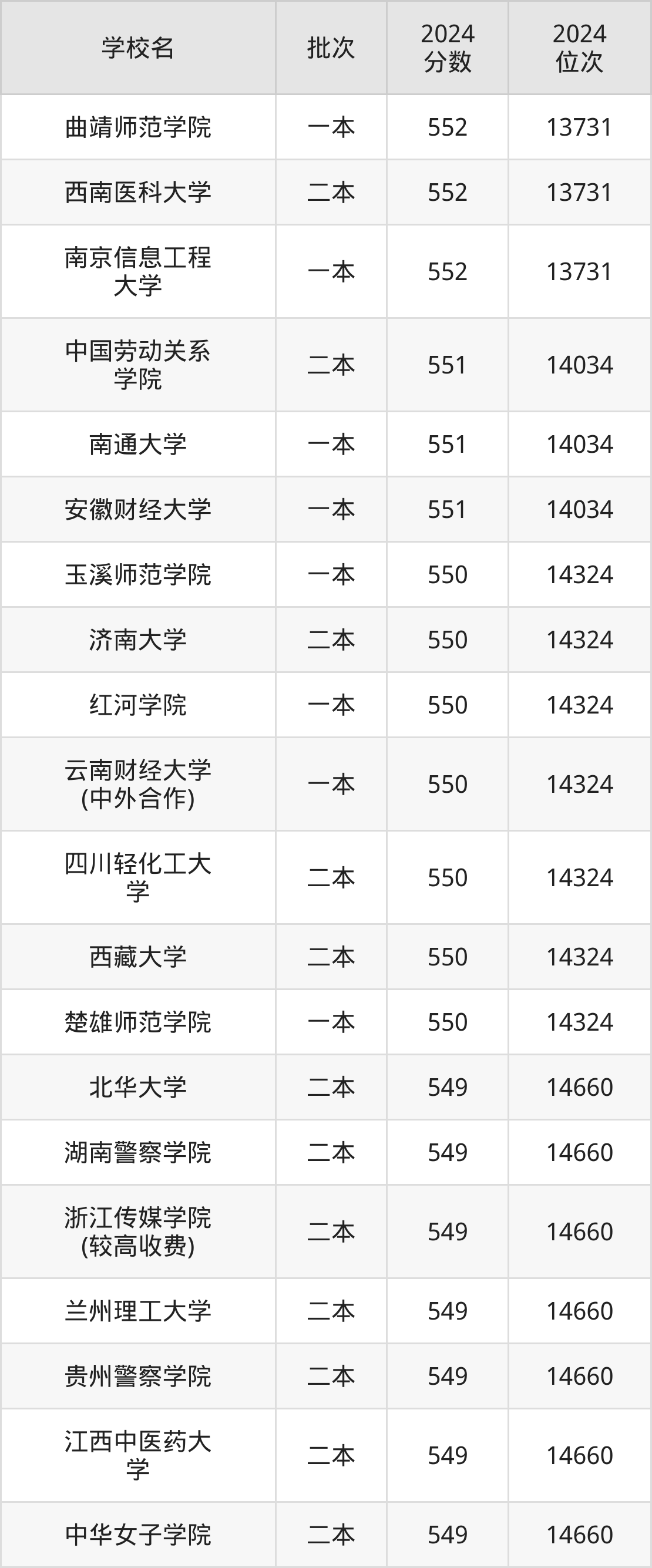 这些都是2025年高考文科14035名~14324名考生可以报考的大学,更多学校名单如下表所示: