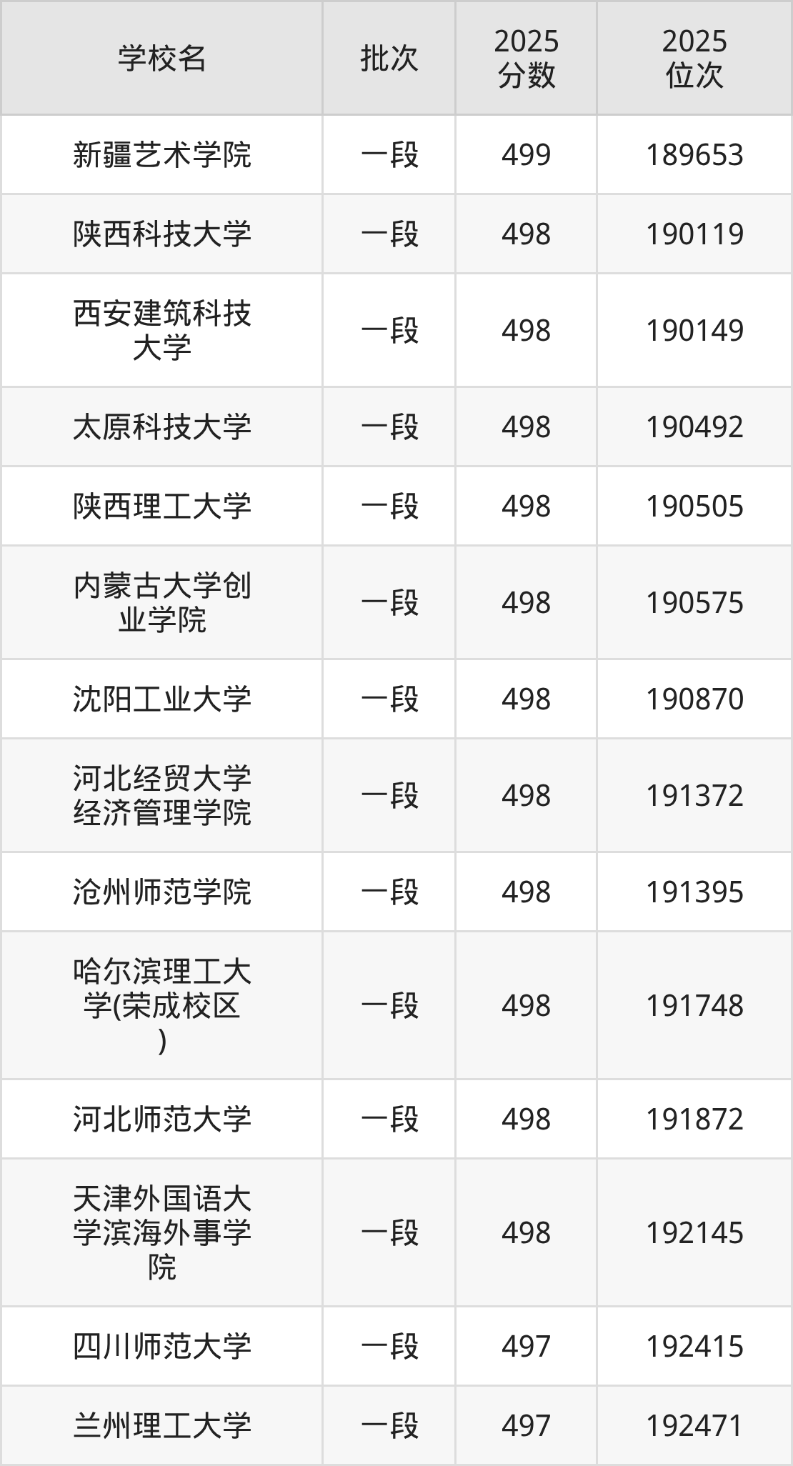 另外录取位次低于该区间(较稳妥)的有四川师范大学(192415名)、兰州理工大学(192471名)等;录取位次高于该区间(可冲)的有新疆艺术学院(189653名)、台州学院(188906名)等。