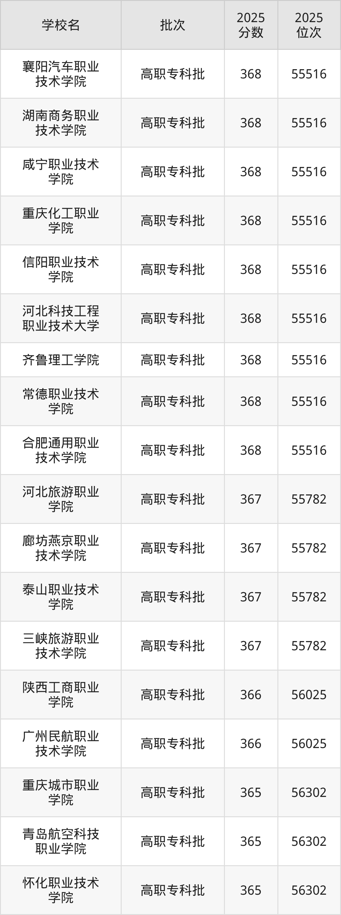 另外录取位次低于该区间(较稳妥)的有重庆城市职业学院(56302名)、怀化职业技术学院(56302名)等;录取位次高于该区间(可冲)的有三峡旅游职业技术学院(55782名)、河北旅游职业学院(55782名)等。