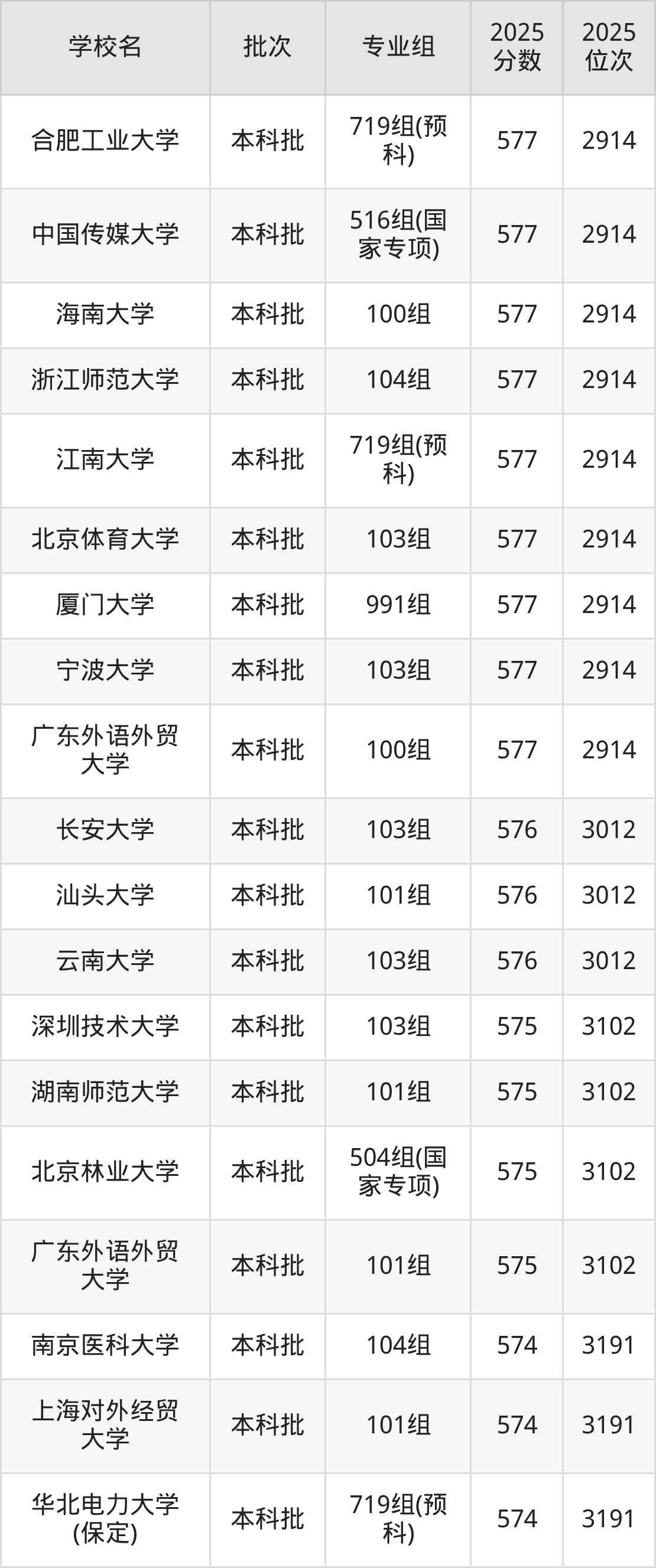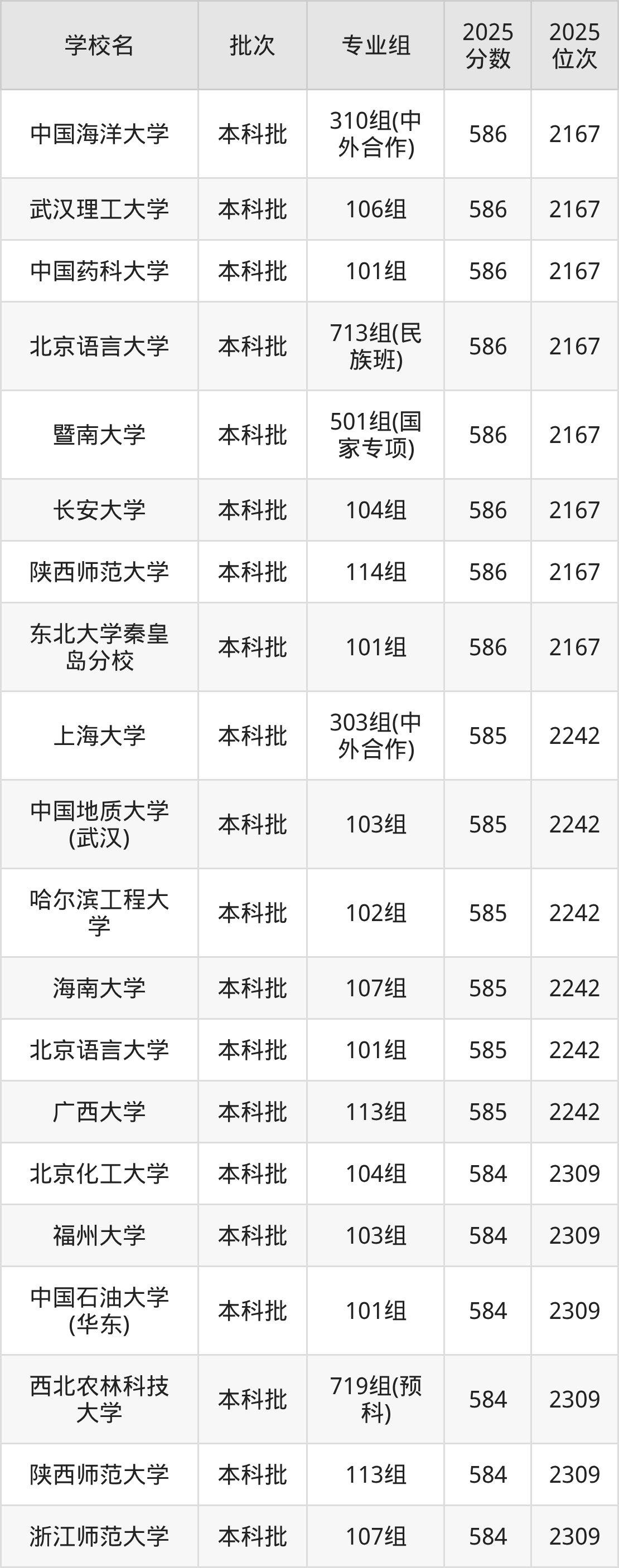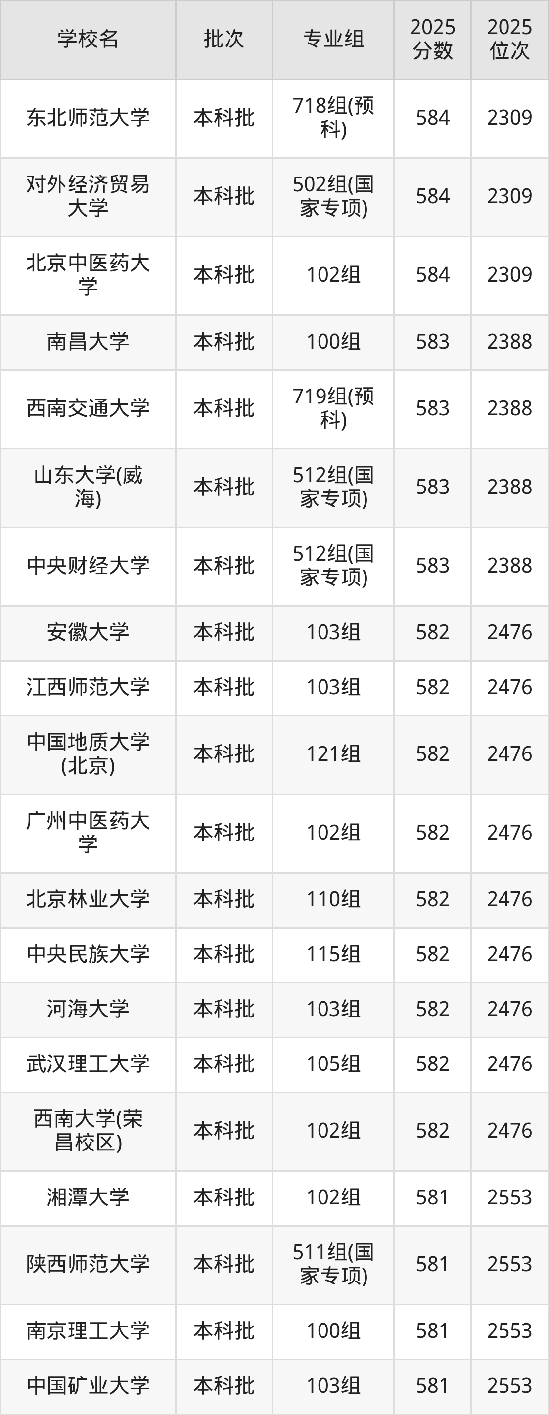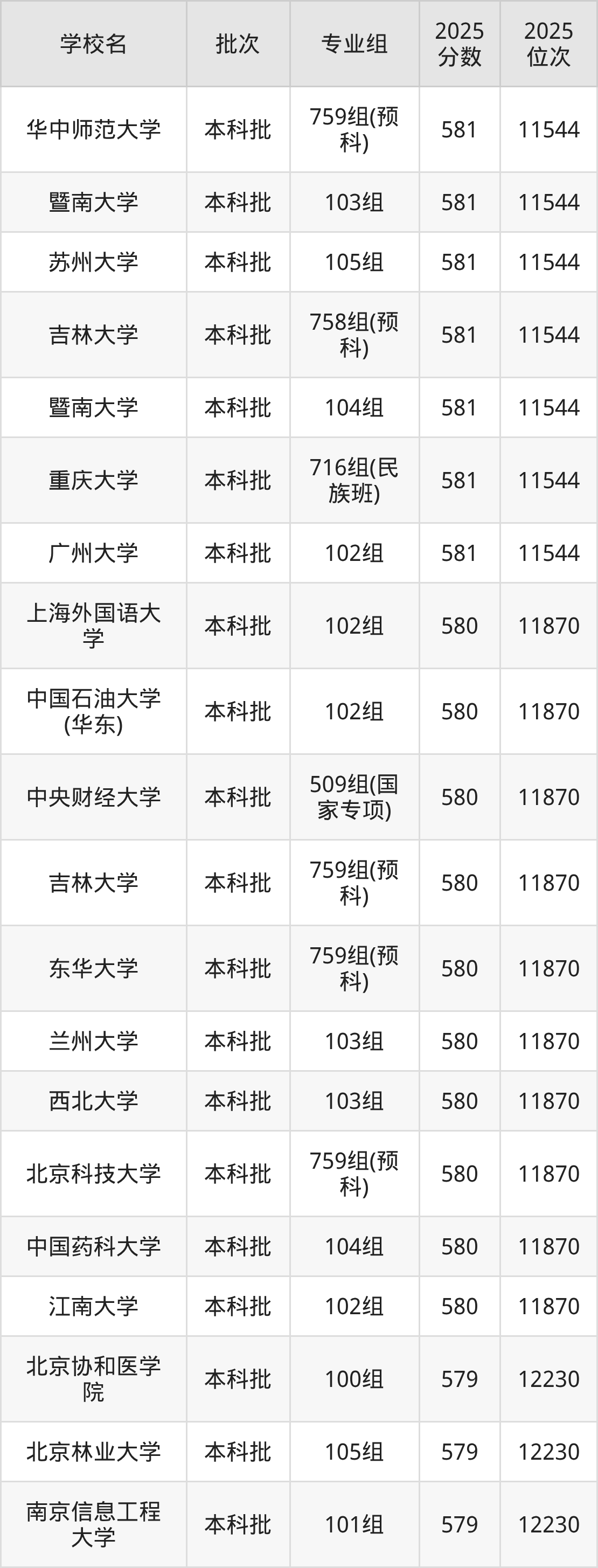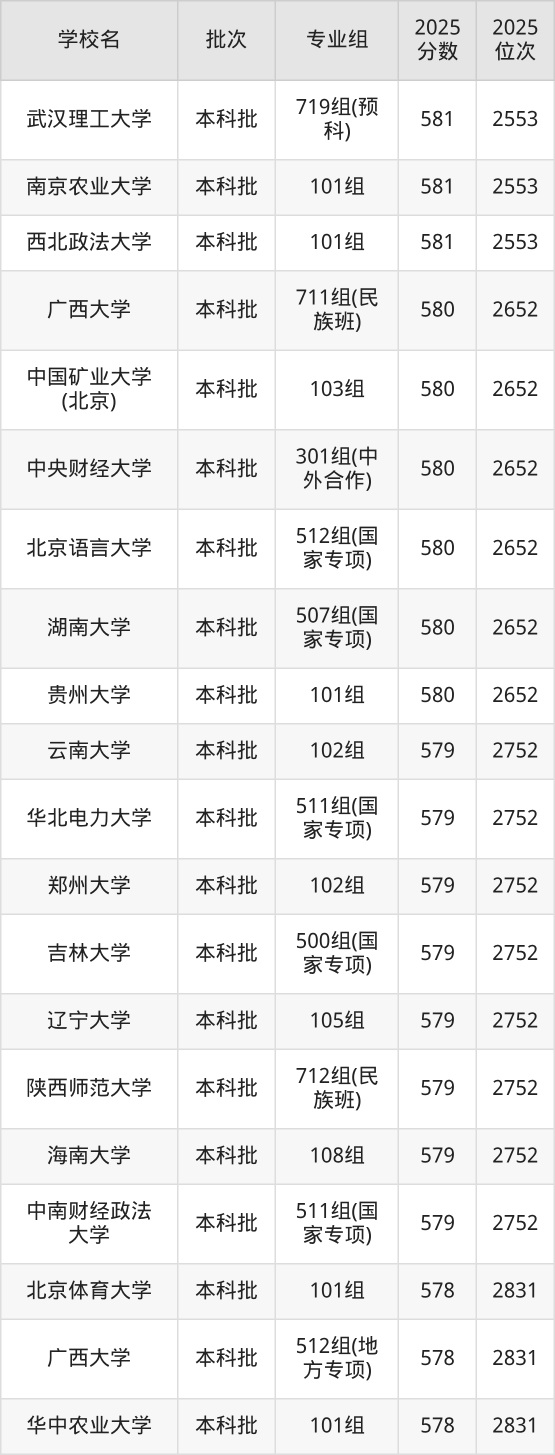 2025年广西高考历史类579分(2653名~2752名)能上的大学有华北电力大学511组(国家专项)、辽宁大学105组、吉林大学500组(国家专项)、郑州大学102组等。