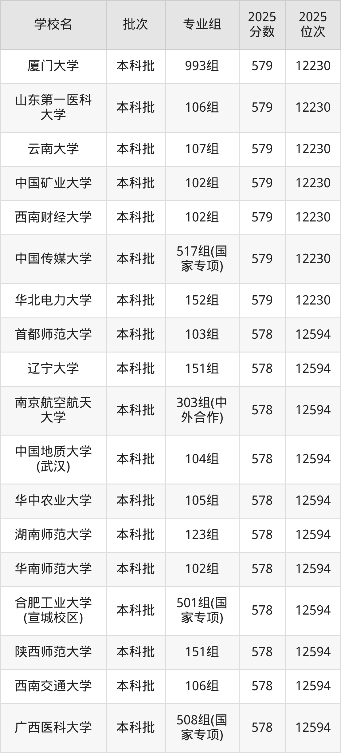 广西高考579分:历史类排名2752位、物理类排名12230位。该分数位次对应能上的大学历史类有华北电力大学511组(国家专项)、辽宁大学105组;物理类有北京林业大学105组、北京协和医学院100组,更多名单如下文所示,2026届考生可参考。
