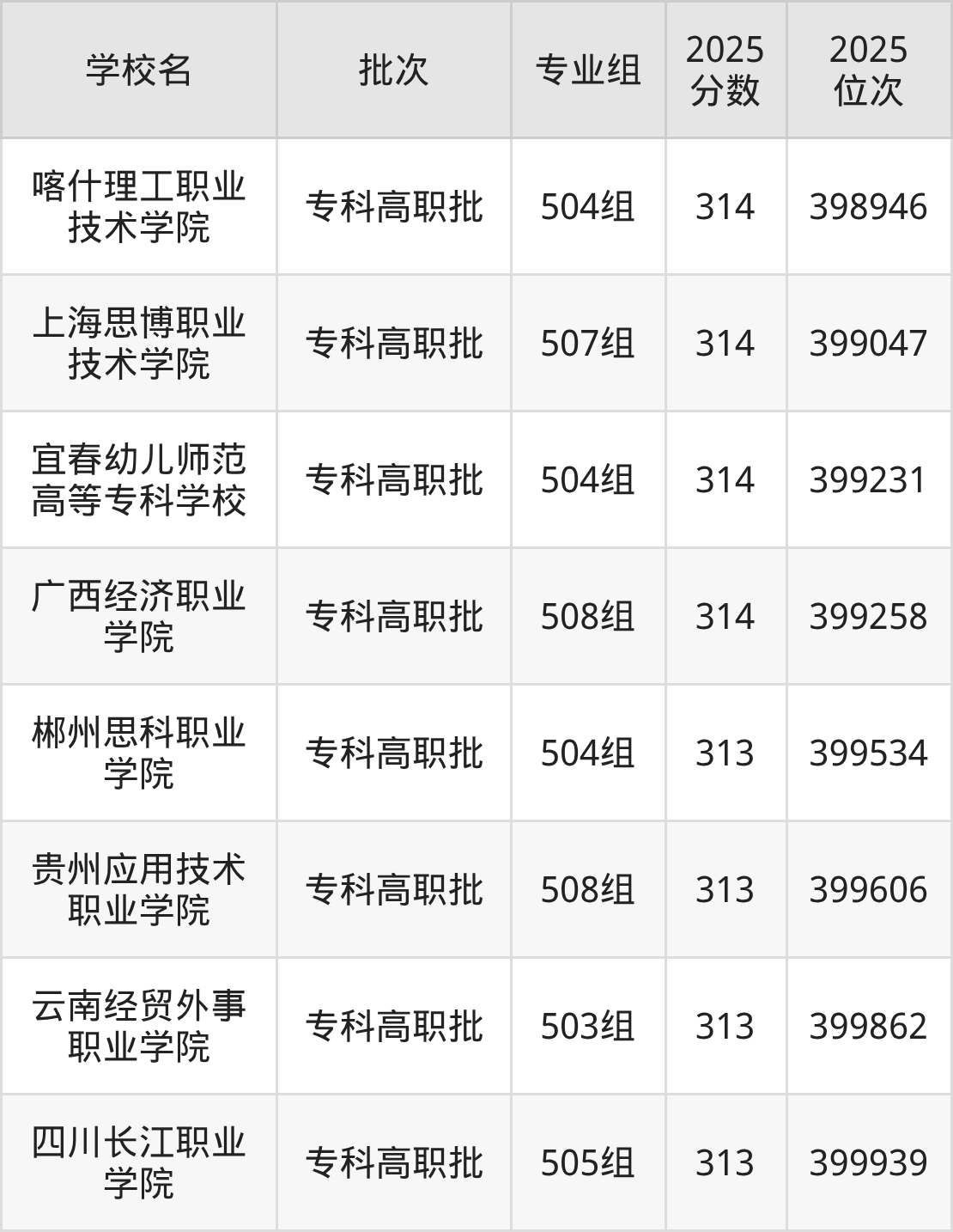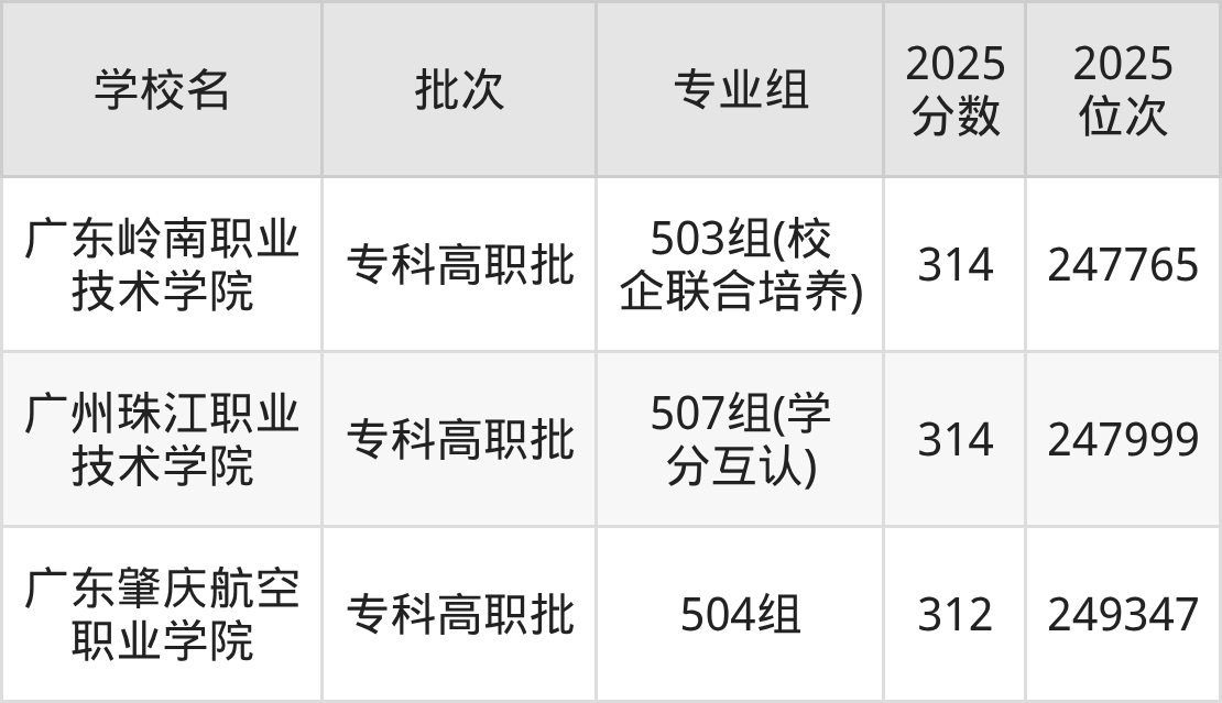 2025年广东高考物理类313分(399289名~399931名)能上的大学有云南经贸外事职业学院503组、四川长江职业学院505组、贵州应用技术职业学院508组、郴州思科职业学院504组。