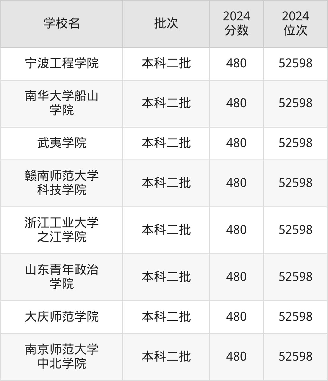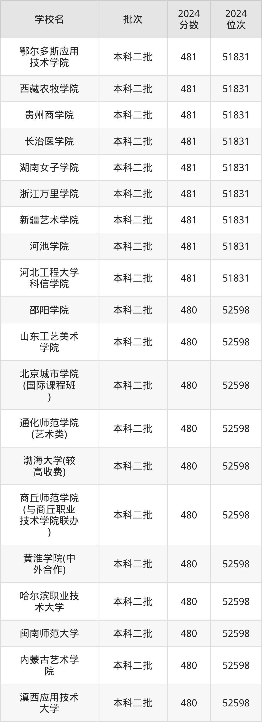 这些都是2025年高考文科51832名~52598名考生可以报考的大学,更多学校名单如下表所示: