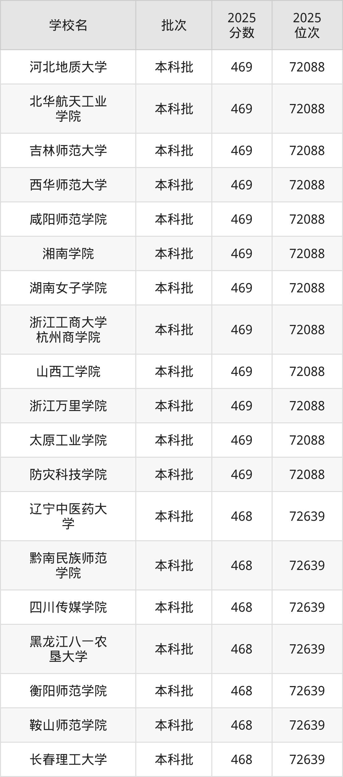 2025年辽宁高考物理类468分(72089名~72639名)能上的大学有长春理工大学、鞍山师范学院、衡阳师范学院、黑龙江八一农垦大学等。