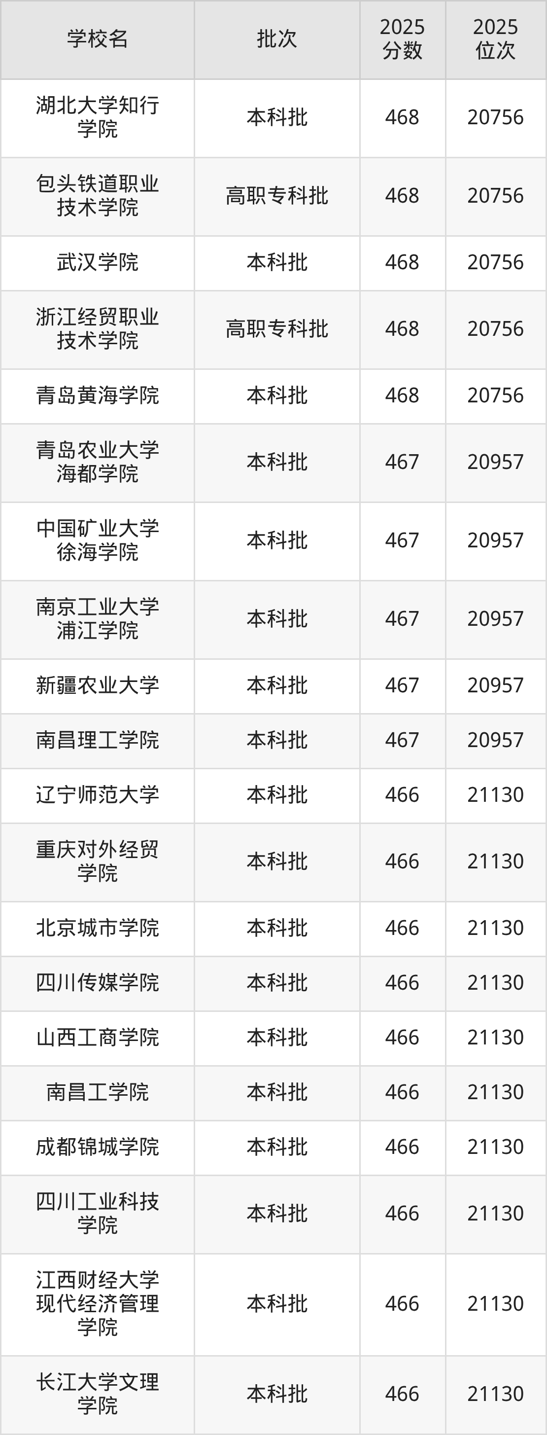 2025年辽宁高考历史类468分(20568名~20756名)能上的大学有青岛黄海学院、浙江经贸职业技术学院、武汉学院、山东财经大学东方学院等。