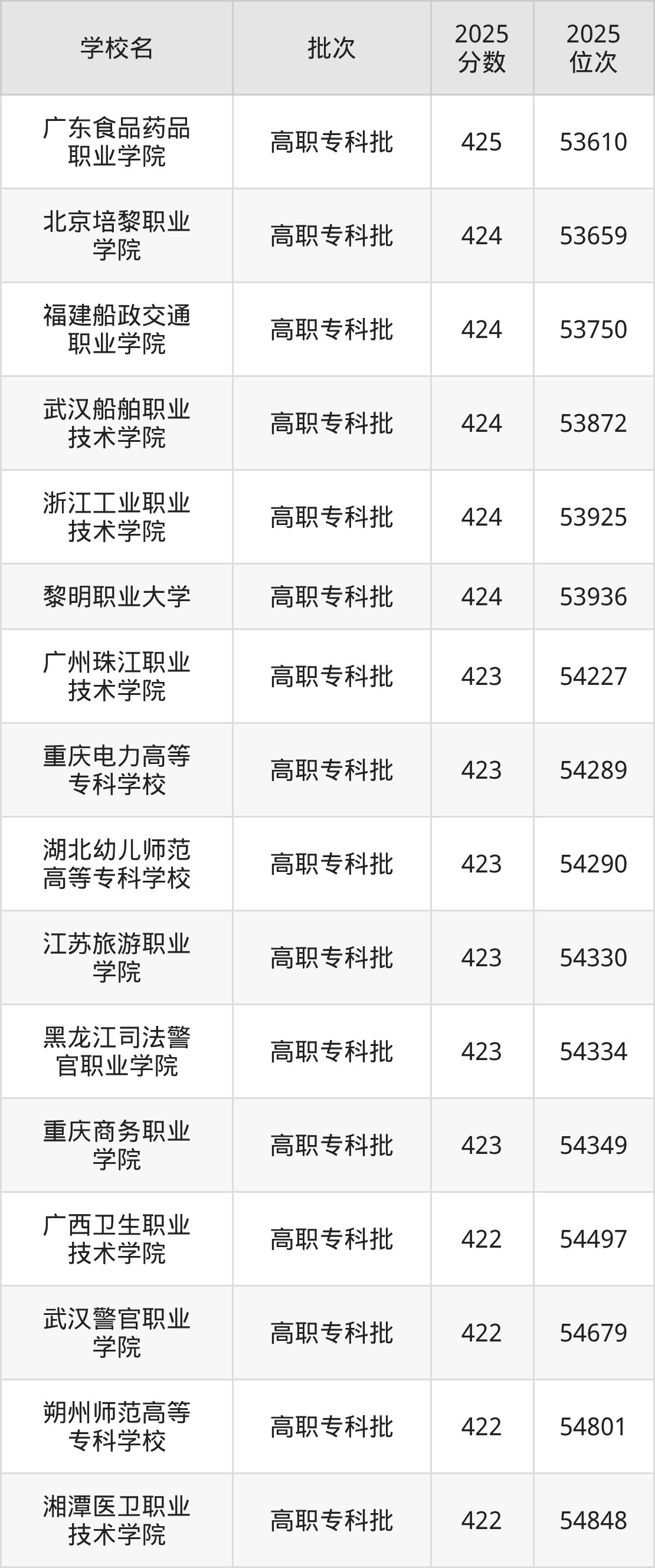 2025年贵州高考历史类423分(54054名~54484名)能上的大学有重庆电力高等专科学校、江苏旅游职业学院、湖北幼儿师范高等专科学校、重庆商务职业学院等。