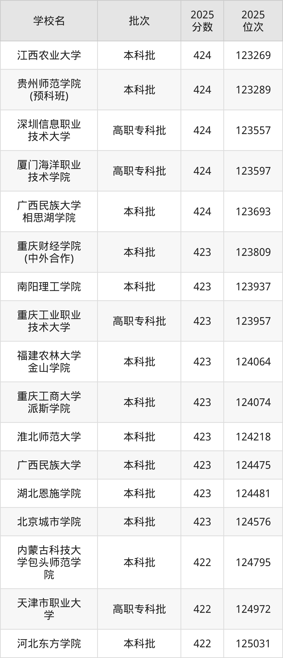 2025年贵州高考物理类423分(123708名~124735名)能上的大学有重庆财经学院(中外合作)、广西民族大学、北京城市学院、重庆工业职业技术大学等。
