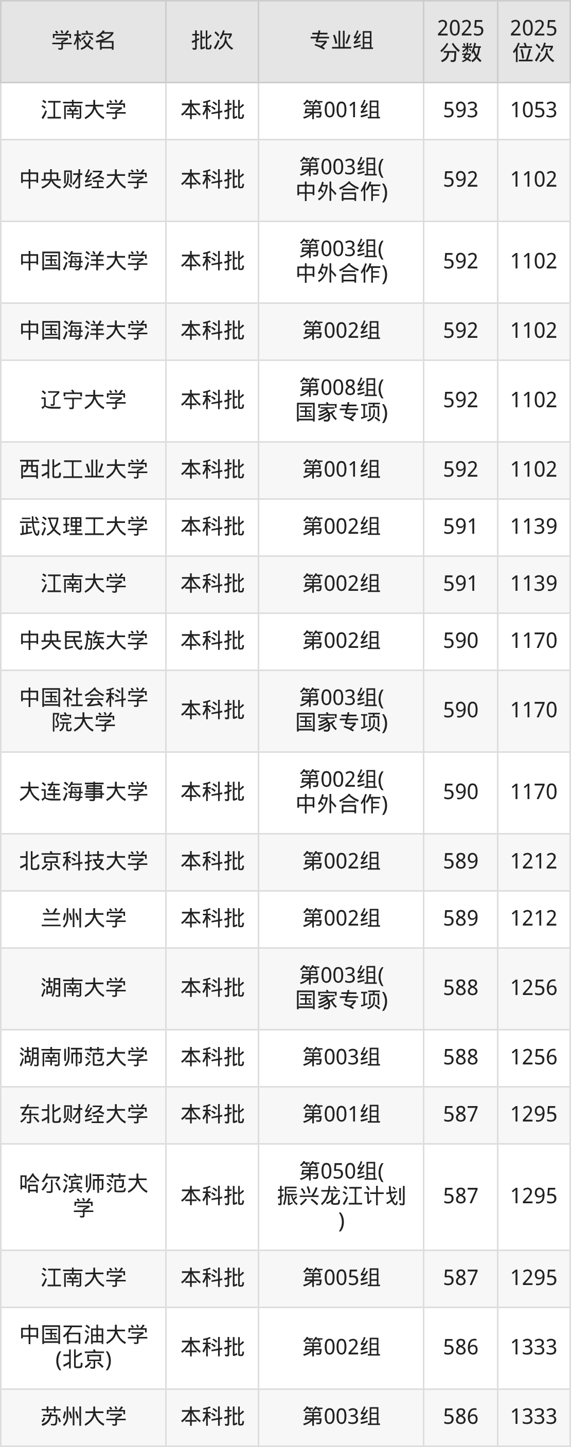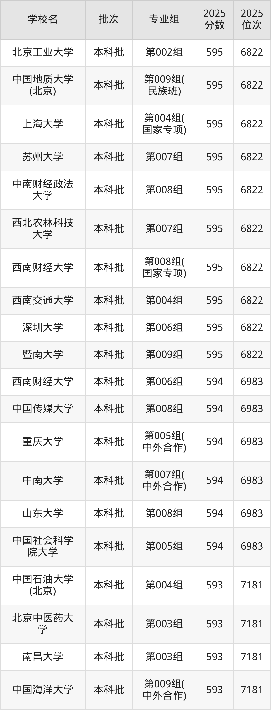 2025年黑龙江高考物理类594分(6823名~6983名)能上的大学有中国传媒大学第008组、中国社会科学院大学第005组、山东大学第008组、中南大学第007组(中外合作)等。