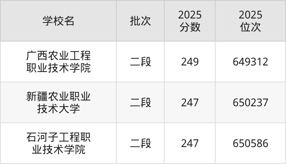 这些都是2026年高考649445名~650189名考生可以报考的大学,更多学校名单如下表所示:
