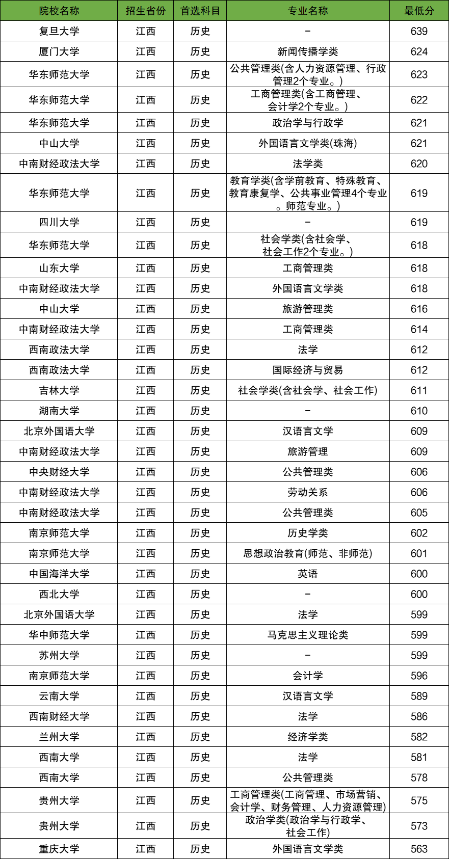 2024年在江西历史类招生的高校专项计划院校中,录取分数线最低的是重庆大学,该校外国语言文学类专业(高校专项)分数线为563分。江西历史类考生最低仅需要563分就能报考这所985高校。