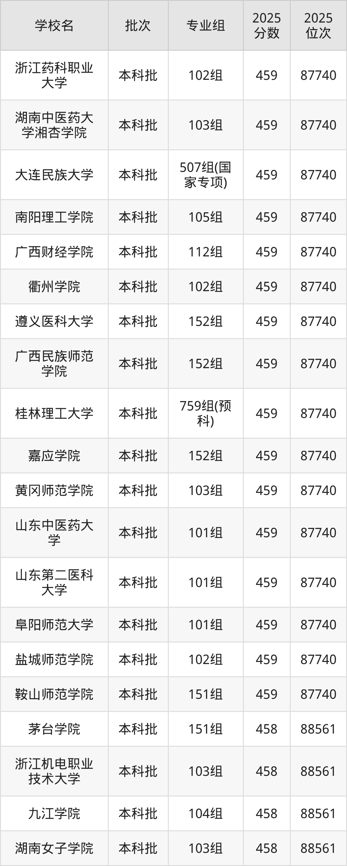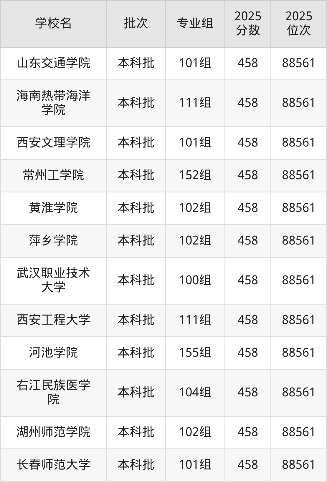 2025年广西高考物理类458分(87741名~88561名)能上的大学有长春师范大学101组、湖州师范学院102组、右江民族医学院104组、河池学院155组等。