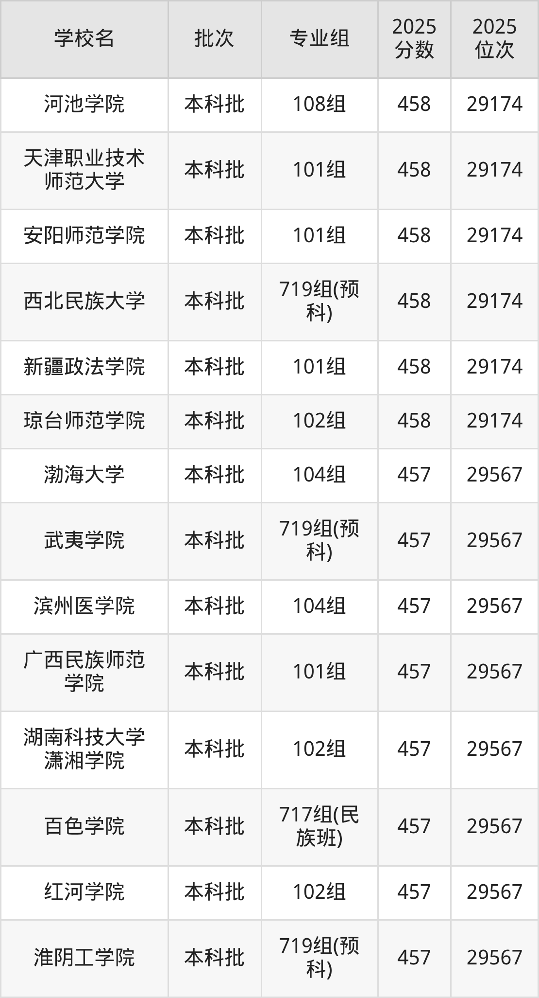 2025年广西高考历史类458分(28820名~29174名)能上的大学有天津职业技术师范大学101组、安阳师范学院101组、河池学院108组、西北民族大学719组(预科)等。