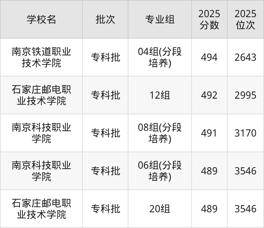 另外录取位次低于该区间(较稳妥)的有南京科技职业学院06组(分段培养)(3546名)、石家庄邮电职业技术学院20组(3546名)等;录取位次高于该区间(可冲)的有东南大学成贤学院11组(173223名)、江苏师范大学科文学院09组(173223名)等。