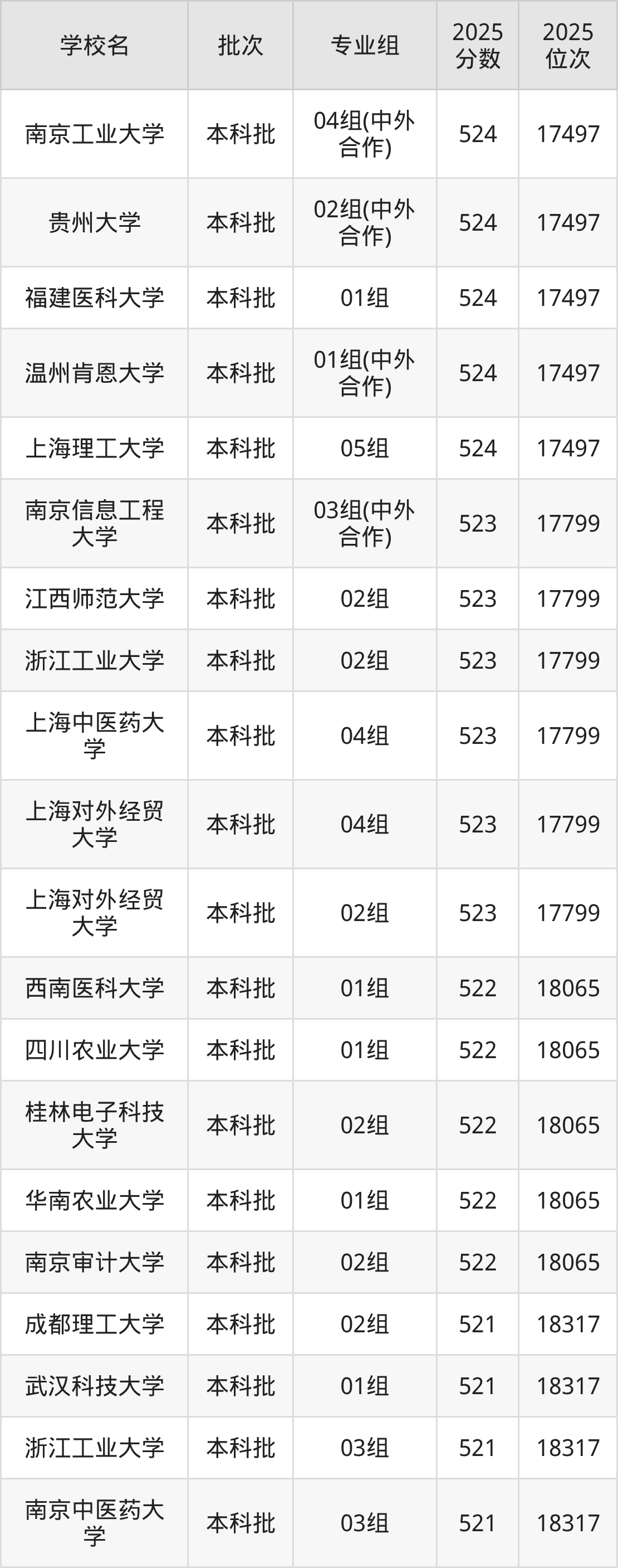 2025年上海高考522分(17800名~18065名)能上的大学有南京审计大学02组、华南农业大学01组、桂林电子科技大学02组、四川农业大学01组等。