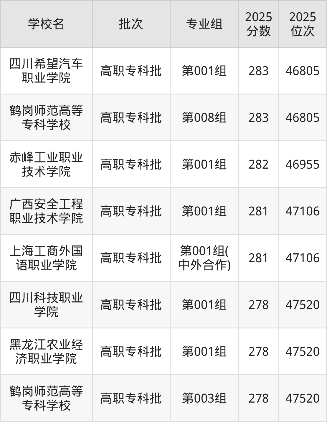 2025年黑龙江高考历史类279分(47233名~47378名)录取位次低于该区间(较稳妥)的有黑龙江农业经济职业学院第001组(47520名)、鹤岗师范高等专科学校第003组(47520名)等;录取位次高于该区间(可冲)的有广西安全工程职业技术学院第001组(47106名)、上海工商外国语职业学院第001组(中外合作)(47106名)等。