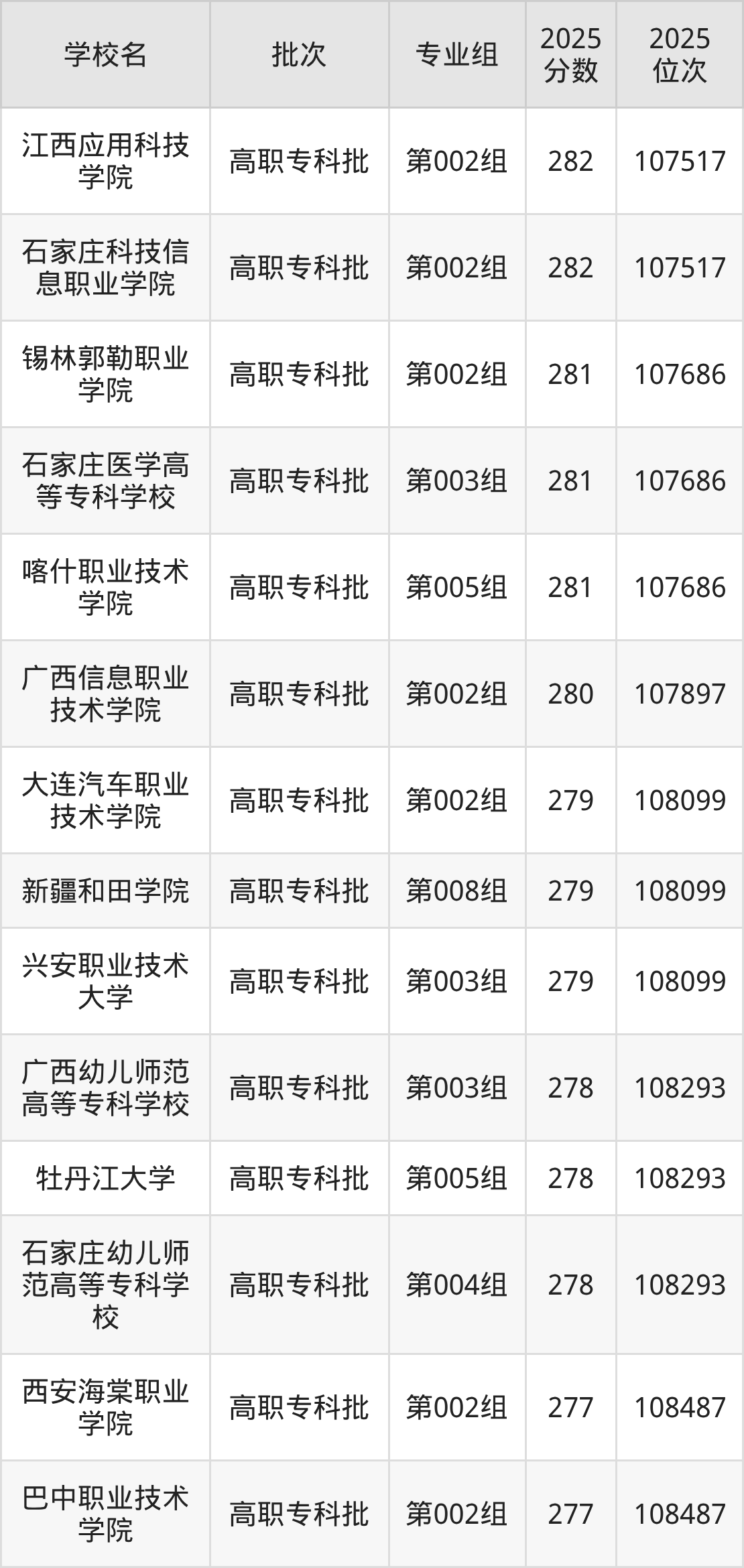 2025年黑龙江高考物理类279分(107898名~108099名)能上的大学有新疆和田学院第008组、兴安职业技术大学第003组、大连汽车职业技术学院第002组。