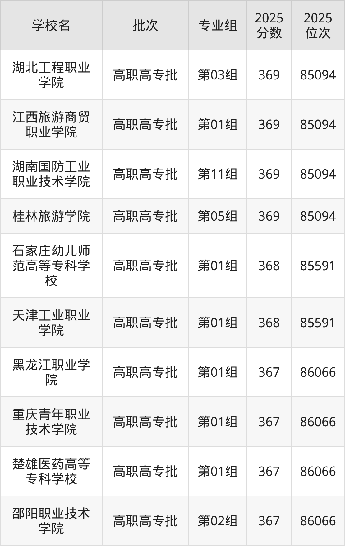 2025年湖北高考历史类367分(85592名~86066名)能上的大学有黑龙江职业学院第01组、邵阳职业技术学院第02组、重庆青年职业技术学院第01组、楚雄医药高等专科学校第01组。