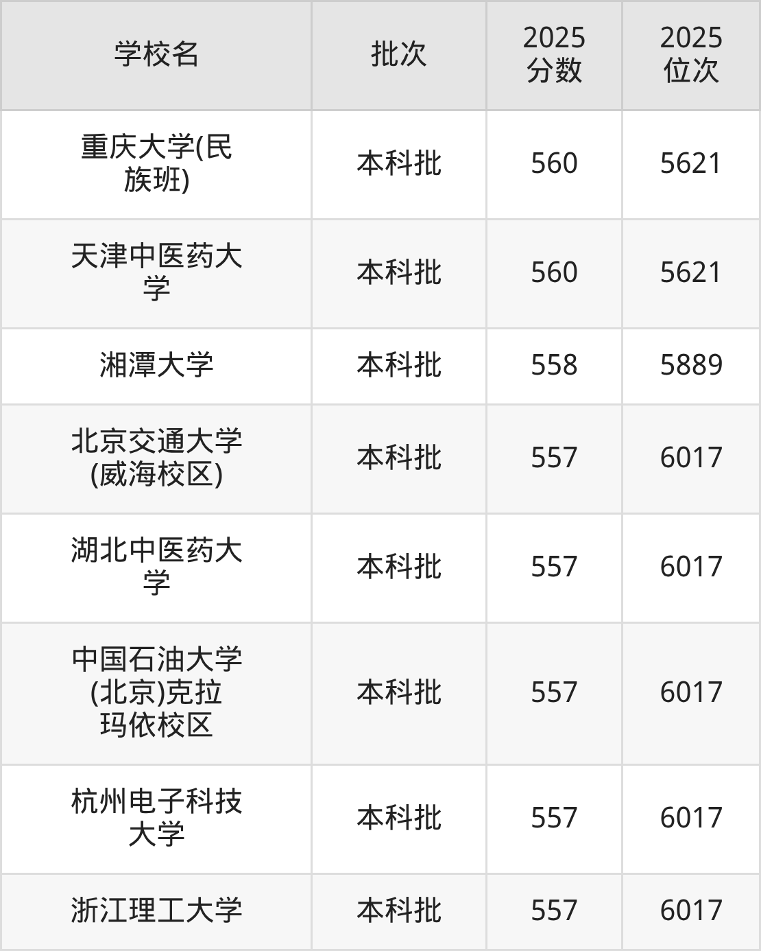 2025年重庆高考历史类560分(5483名~5621名)能上的大学有天津中医药大学、浙江工商大学、南昌大学、陕西师范大学等。