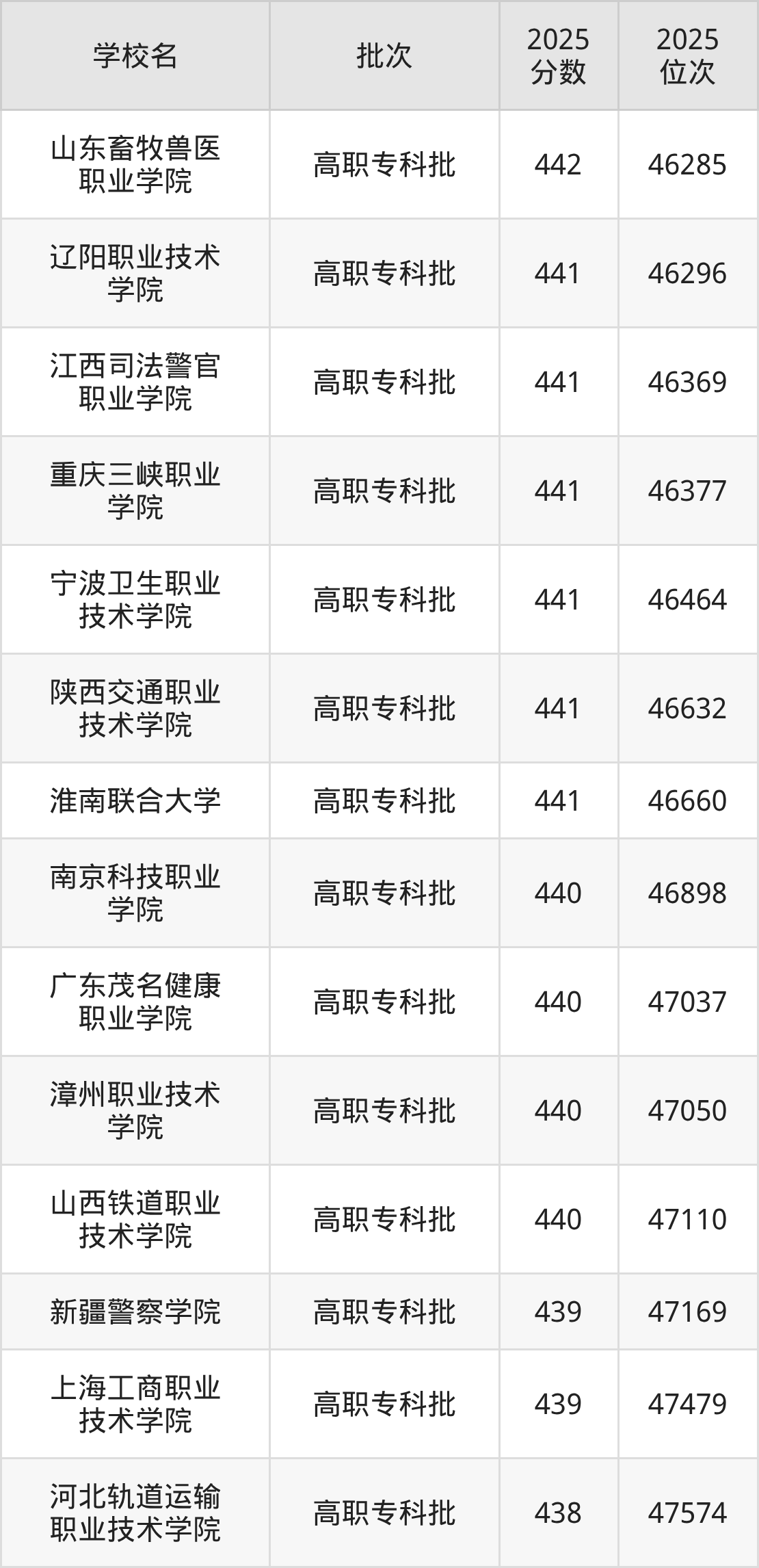 2025年贵州高考历史类440分(46696名~47120名)能上的大学有南京科技职业学院、山西铁道职业技术学院、漳州职业技术学院、广东茂名健康职业学院。
