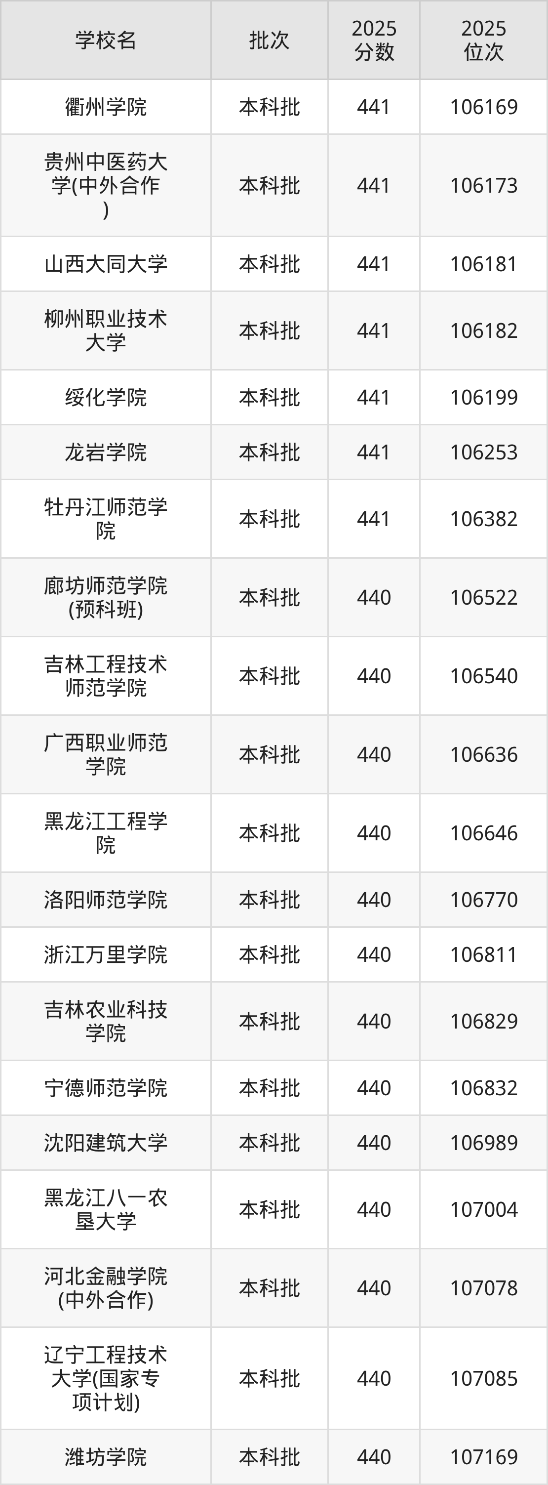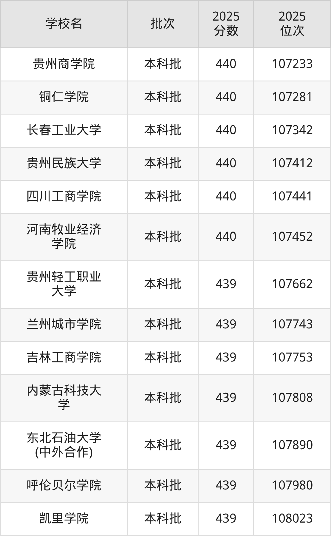 贵州高考440分:历史类排名47120位、物理类排名107535位。该分数位次对应能上的大学历史类有南京科技职业学院、山西铁道职业技术学院;物理类有河南牧业经济学院、洛阳师范学院,更多名单如下文所示,2026届考生可参考。
