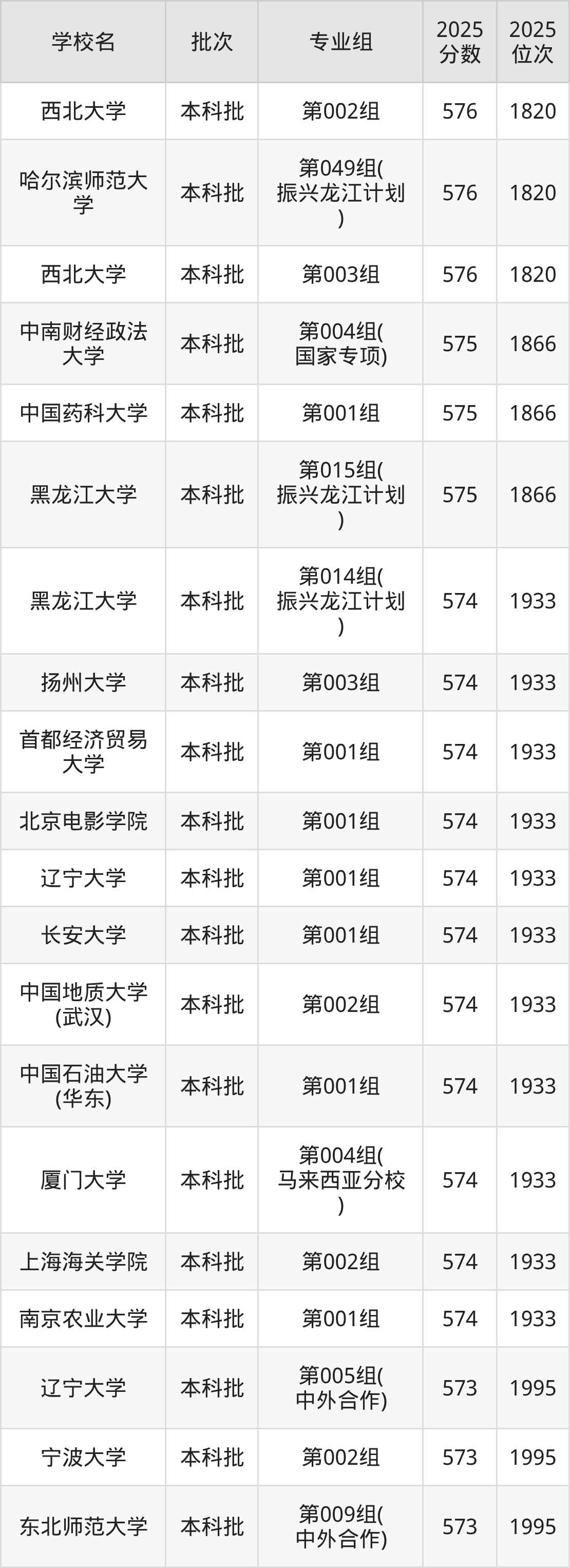 另外录取位次低于该区间(较稳妥)的有北京语言大学第008组(国家专项)(12977名)、天津理工大学第003组(12977名)等;录取位次高于该区间(可冲)的有东北财经大学第008组(12510名)、中南财经政法大学第009组(国家专项)(12510名)等。