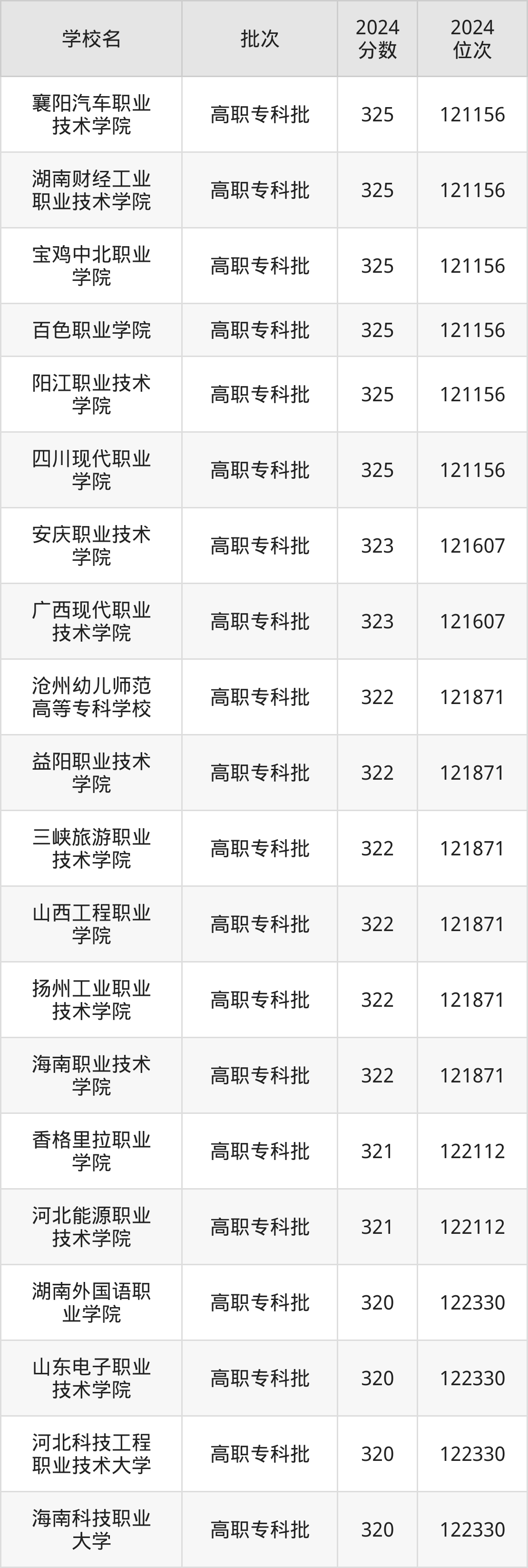 另外录取位次低于该区间(较稳妥)的有香格里拉职业学院(122112名)、河北能源职业技术学院(122112名)等;录取位次高于该区间(可冲)的有广西现代职业技术学院(121607名)、安庆职业技术学院(121607名)等。