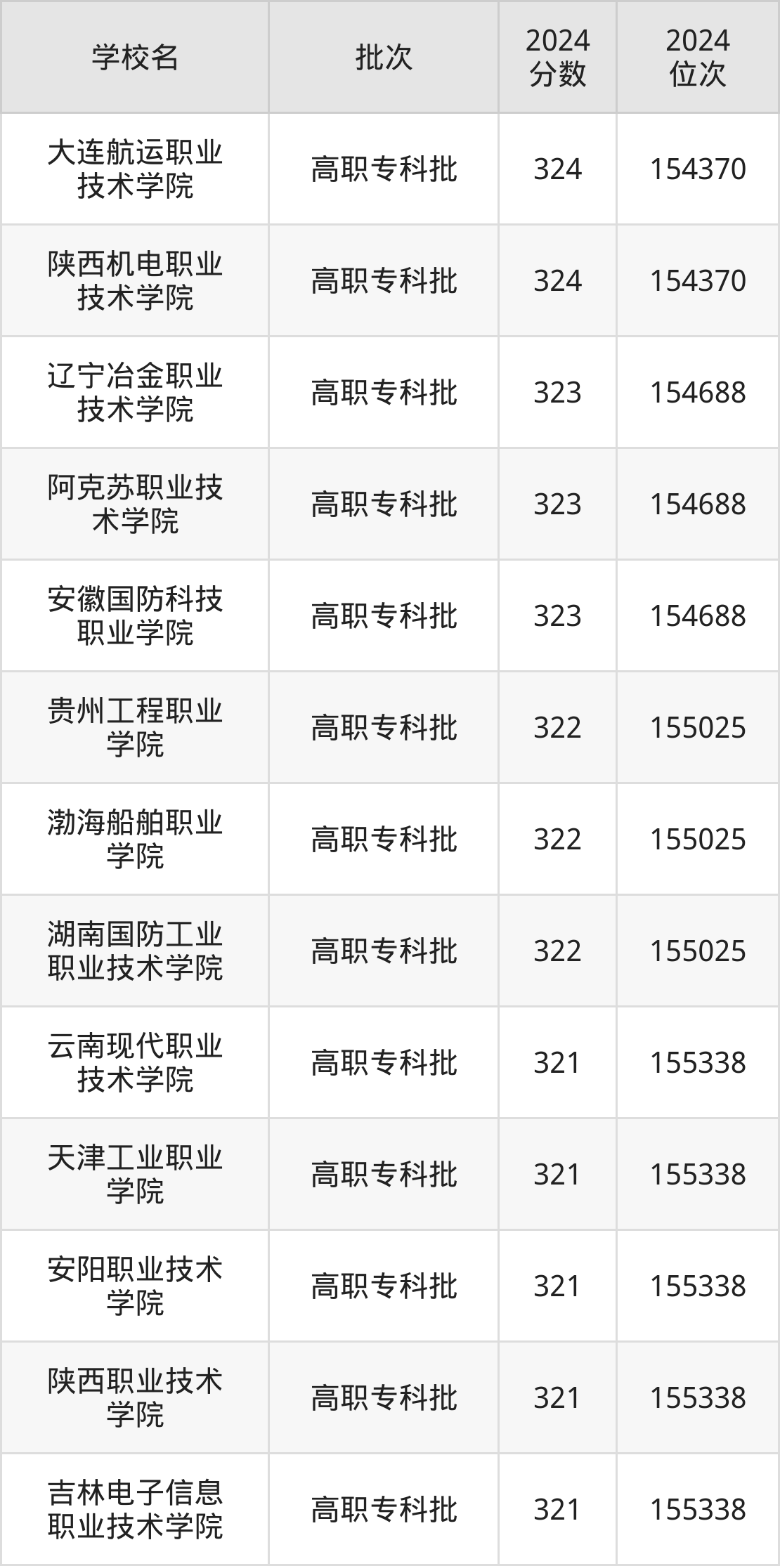 2024年云南高考理科322分(154689名~155025名)能上的大学有湖南国防工业职业技术学院、渤海船舶职业学院、贵州工程职业学院。