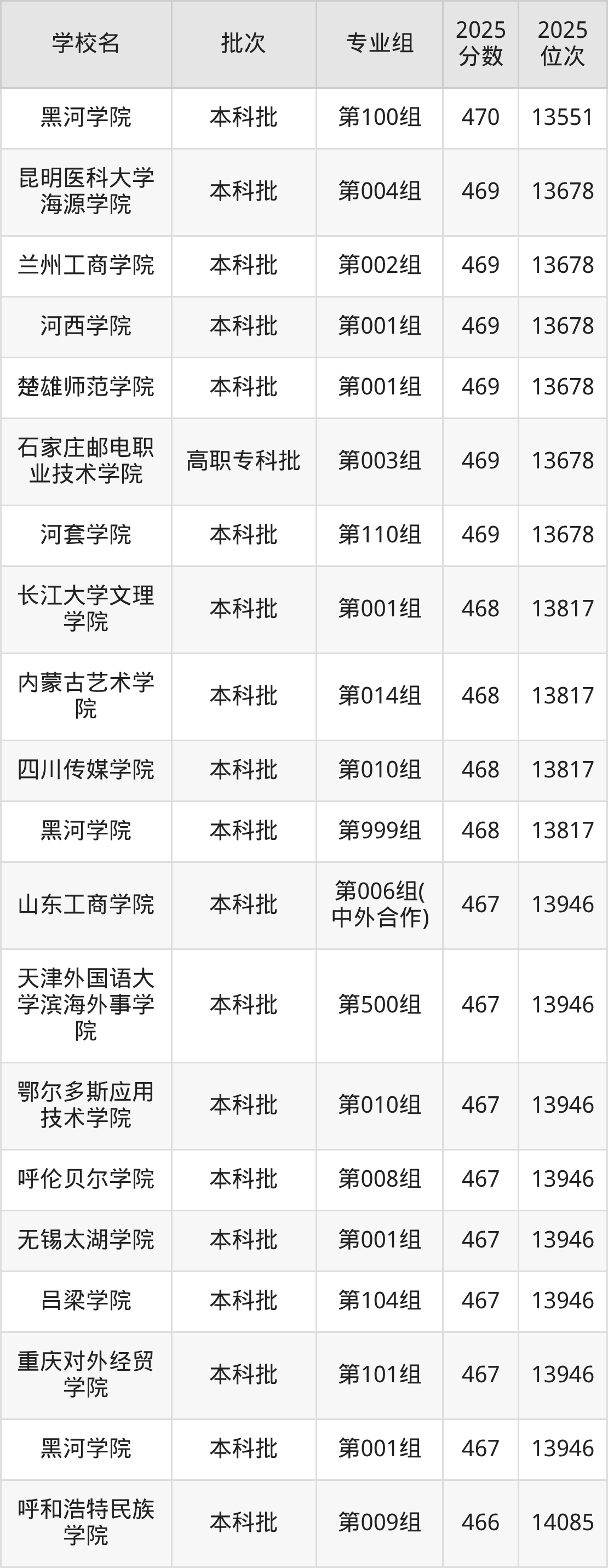 2025年内蒙古高考历史类469分(13552名~13678名)能上的大学有楚雄师范学院第001组、石家庄邮电职业技术学院第003组、河套学院第110组、昆明医科大学海源学院第004组等。