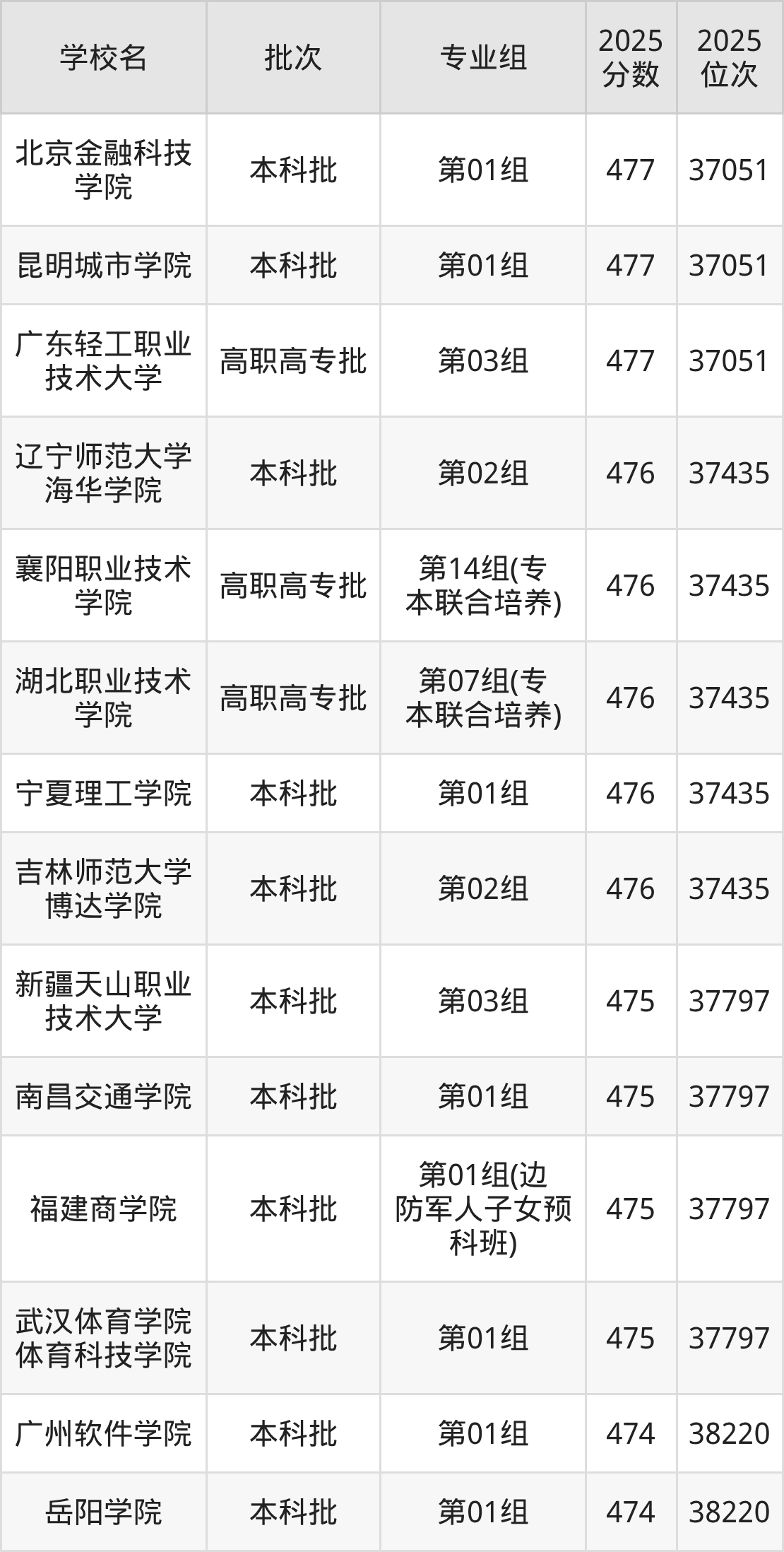 2025年湖北高考历史类475分(37436名~37797名)能上的大学有武汉体育学院体育科技学院第01组、福建商学院第01组(边防军人子女预科班)、南昌交通学院第01组、新疆天山职业技术大学第03组。