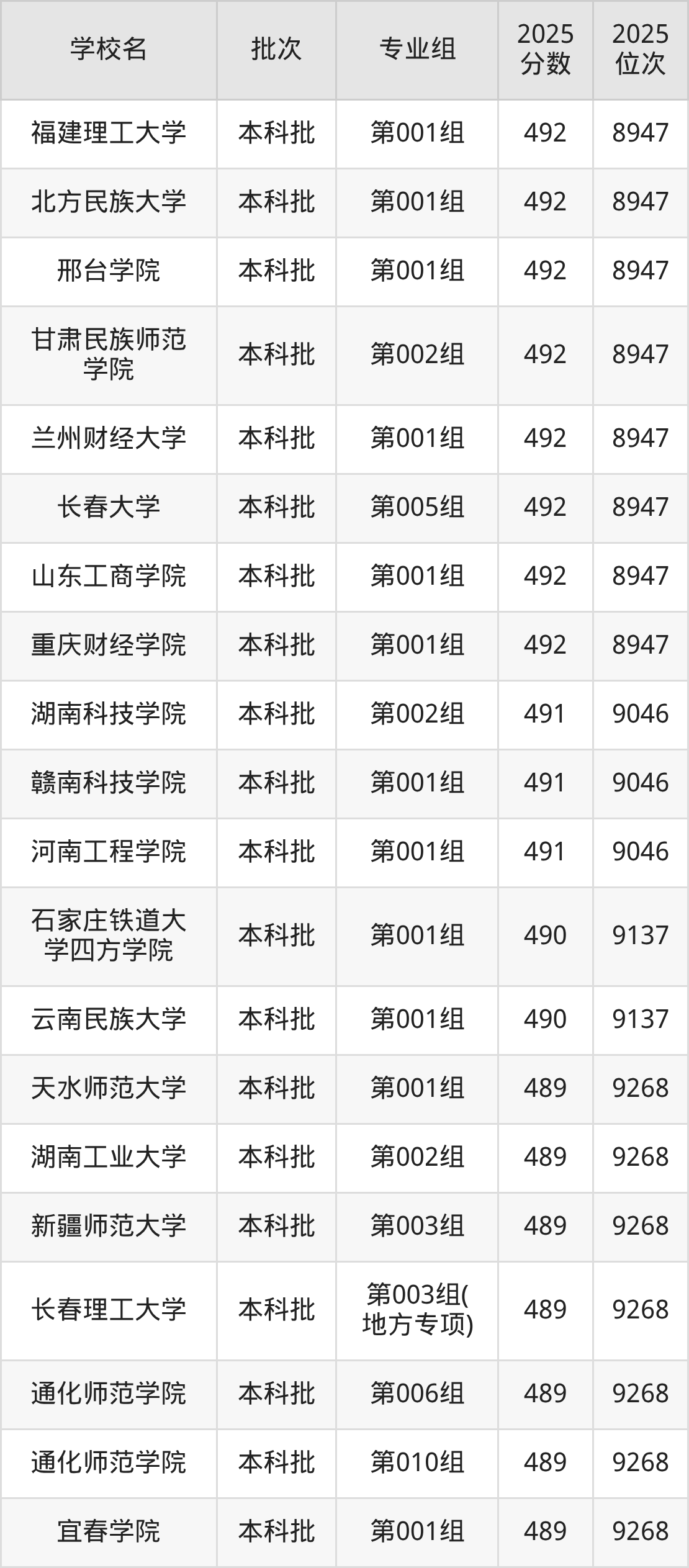 2025年吉林高考历史类490分(9047名~9137名)能上的大学有石家庄铁道大学四方学院第001组、云南民族大学第001组。