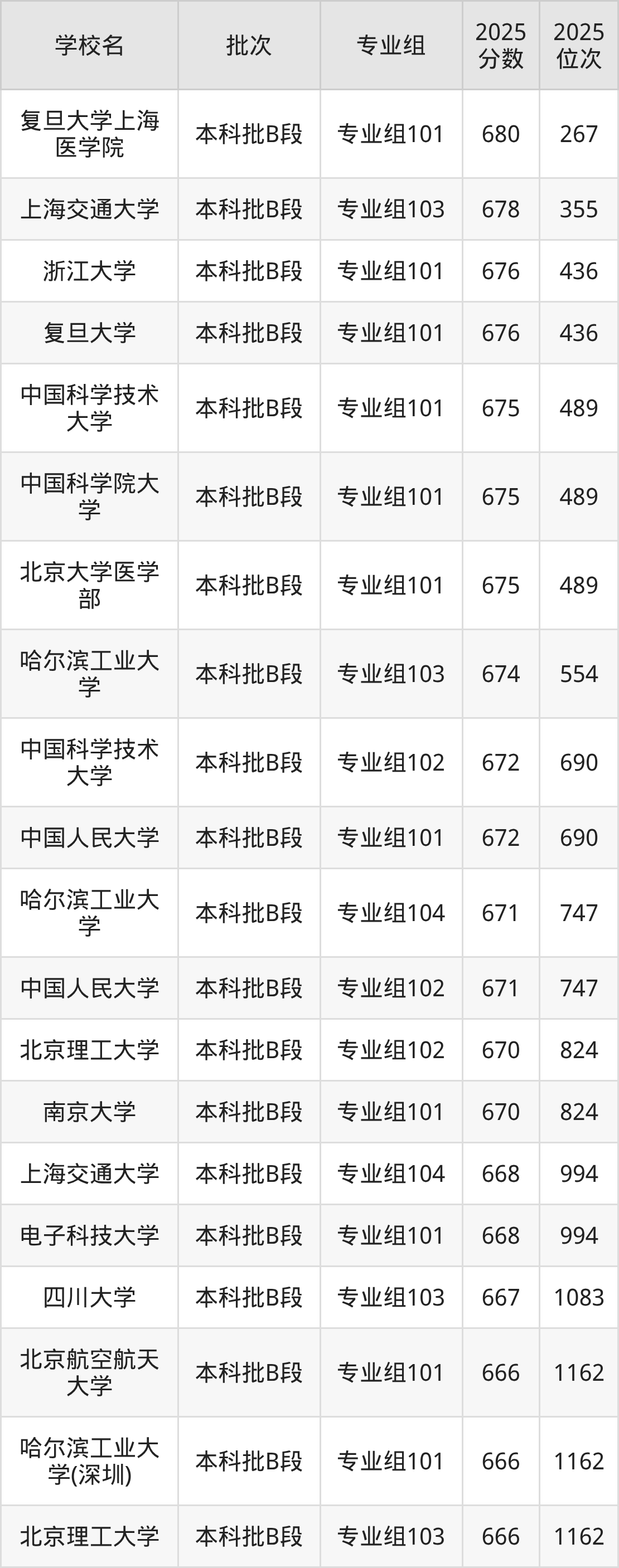 另外录取位次低于该区间(较稳妥)的有电子科技大学专业组101(994名)、上海交通大学专业组104(994名)等;录取位次高于该区间(可冲)的有中国人民大学专业组102(747名)、哈尔滨工业大学专业组104(747名)等。