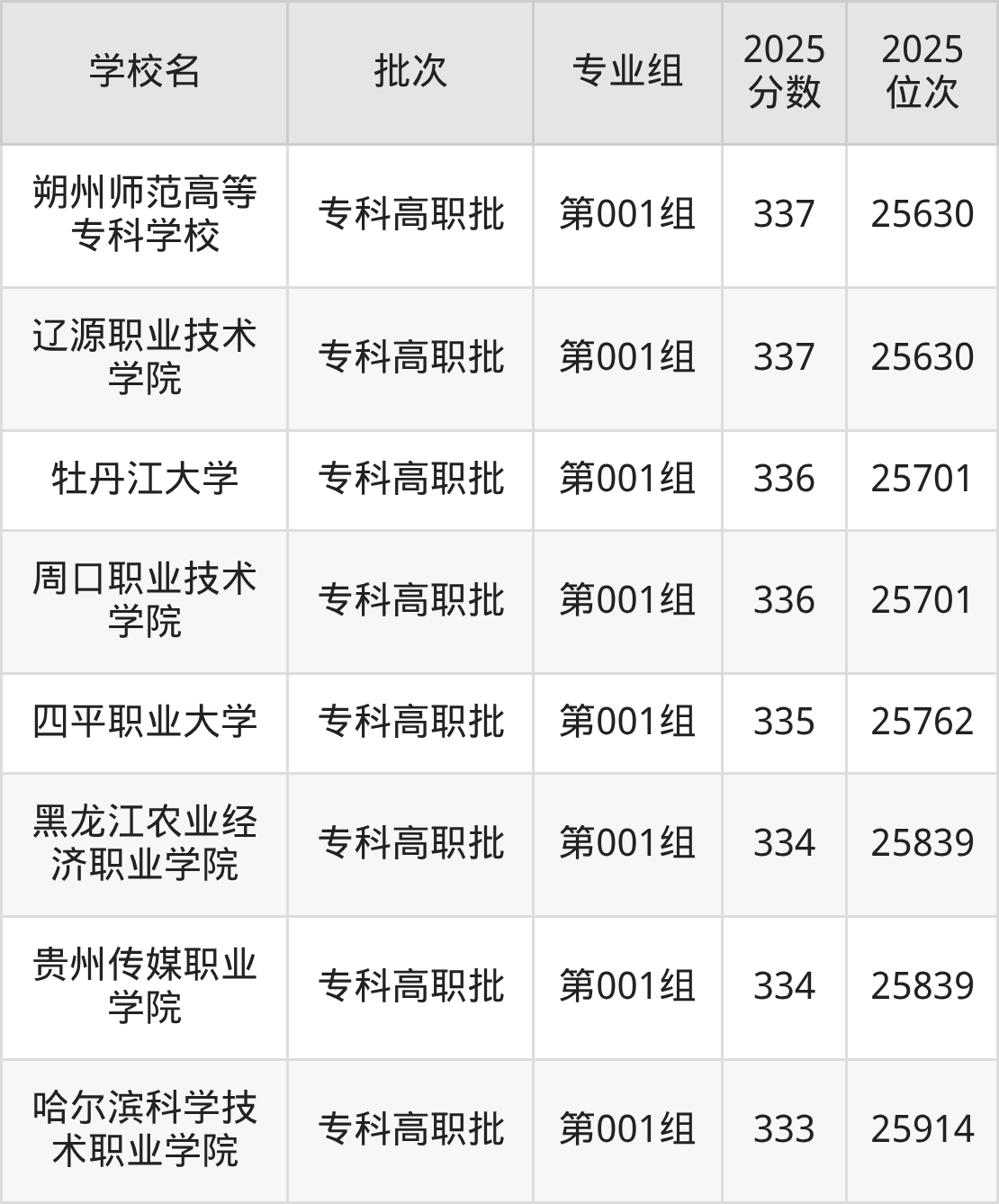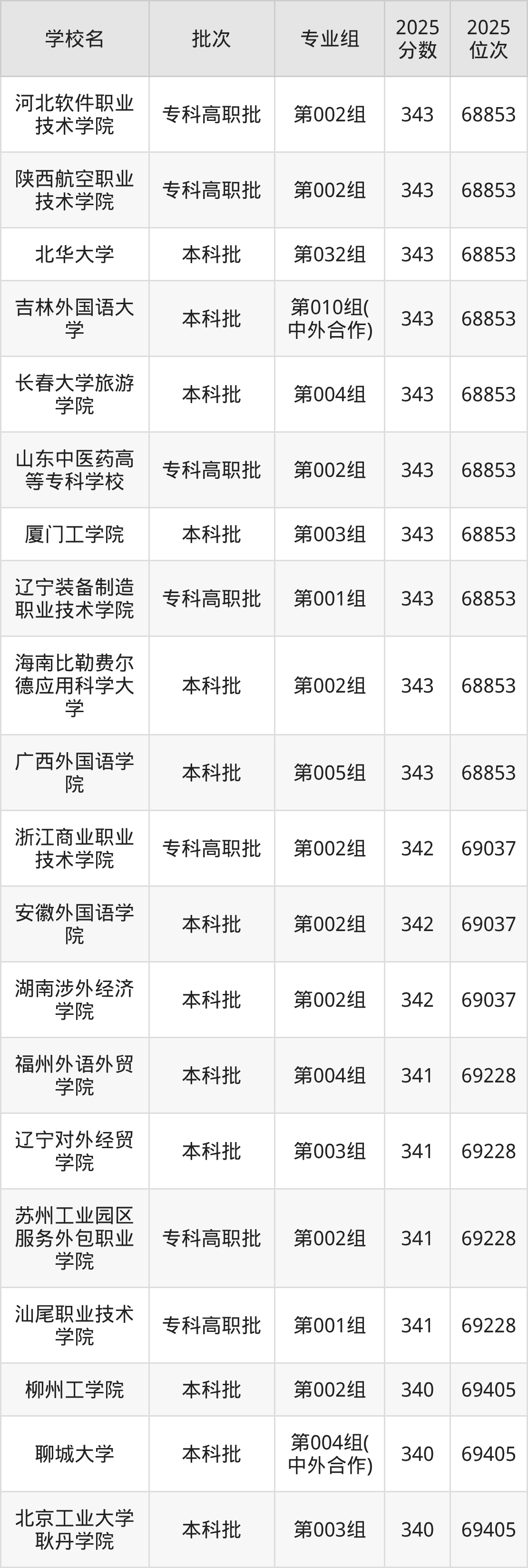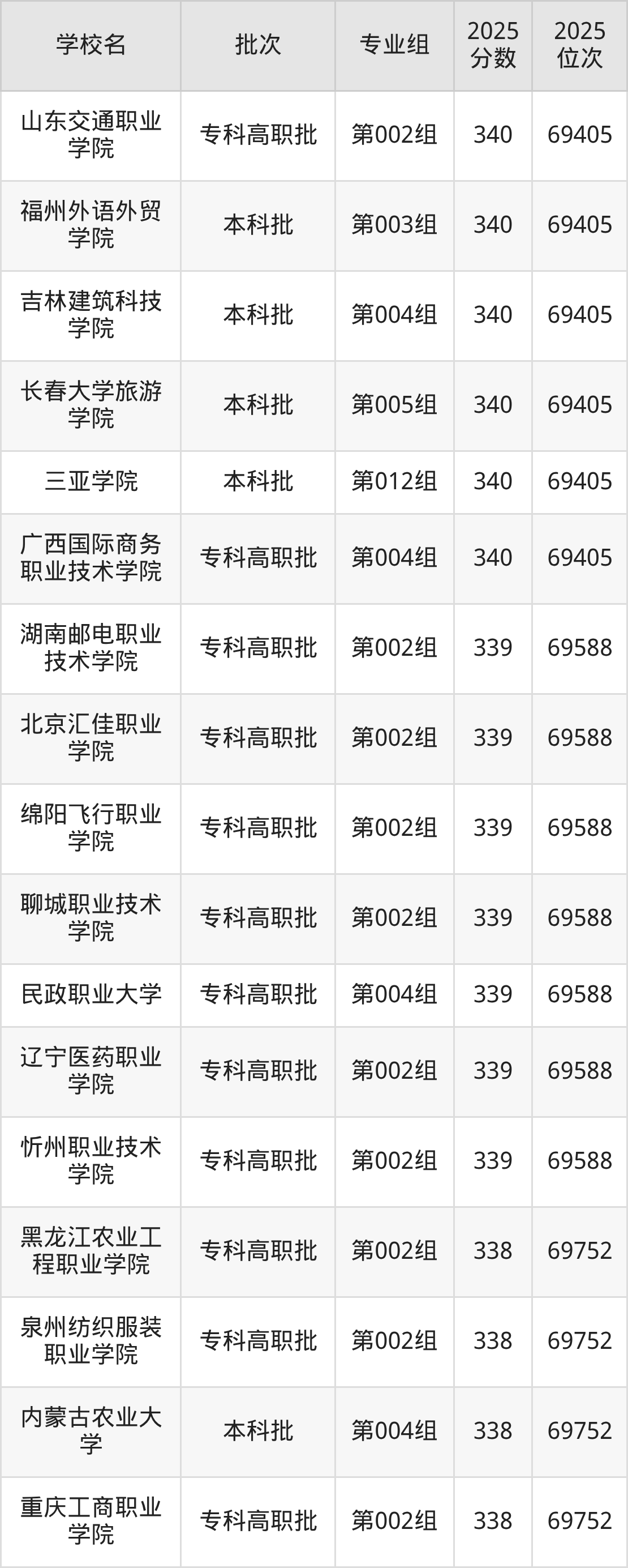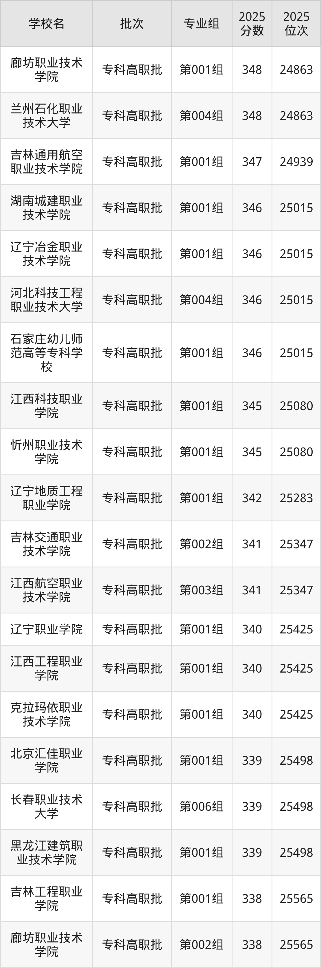 2025年吉林高考历史类340分(25348名~25425名)能上的大学有辽宁职业学院第001组、江西工程职业学院第001组、克拉玛依职业技术学院第001组。
