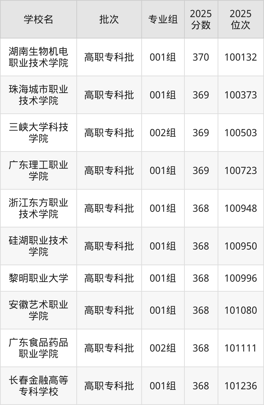 2025年安徽高考历史类369分(100360名~100838名)能上的大学有广东理工职业学院001组、珠海城市职业技术学院001组、三峡大学科技学院002组。