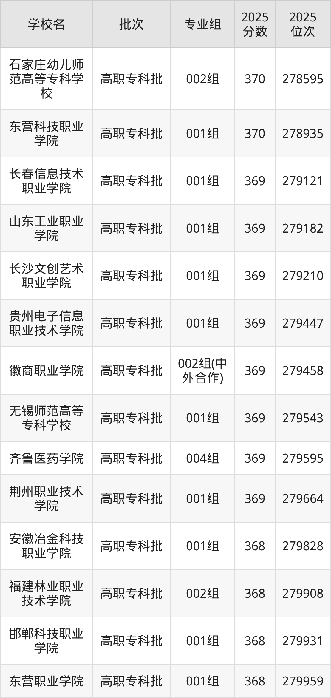 2025年安徽高考物理类369分(279081名~279727名)能上的大学有长春信息技术职业学院001组、长沙文创艺术职业学院001组、贵州电子信息职业技术学院001组、荆州职业技术学院001组等。