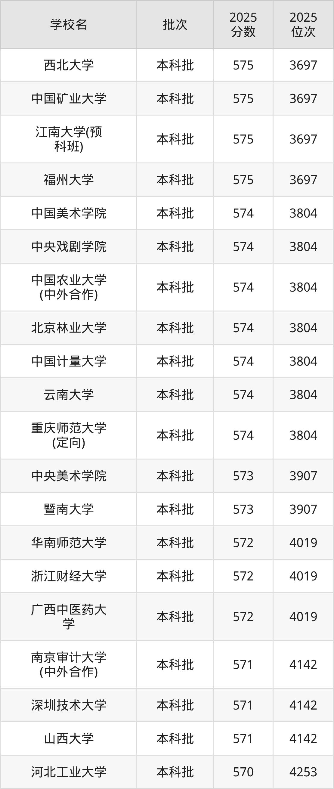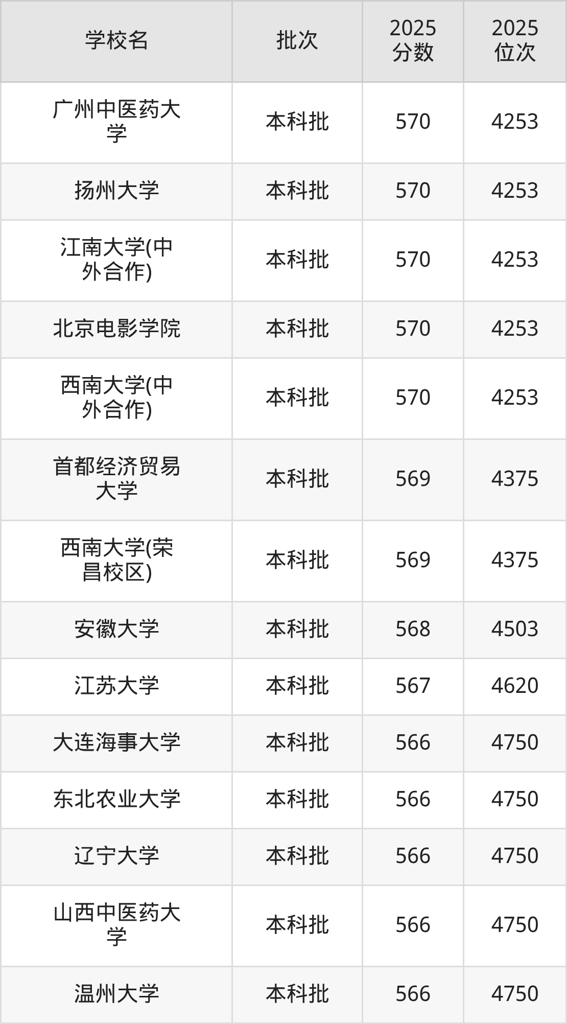 2025年重庆高考历史类570分(4143名~4253名)能上的大学有西南大学(中外合作)、北京电影学院、河北工业大学、广州中医药大学等。