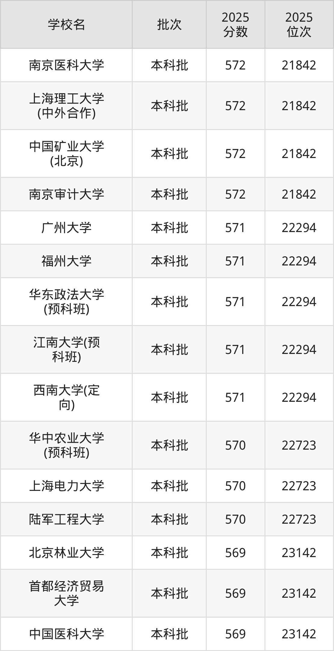 2025年重庆高考物理类570分(22295名~22723名)能上的大学有华中农业大学(预科班)、上海电力大学、陆军工程大学。