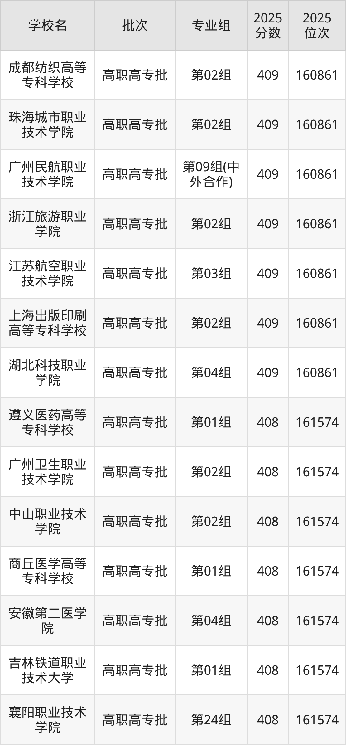 2025年湖北高考物理类408分(160862名~161574名)能上的大学有襄阳职业技术学院第24组、吉林铁道职业技术大学第01组、安徽第二医学院第04组、商丘医学高等专科学校第01组等。
