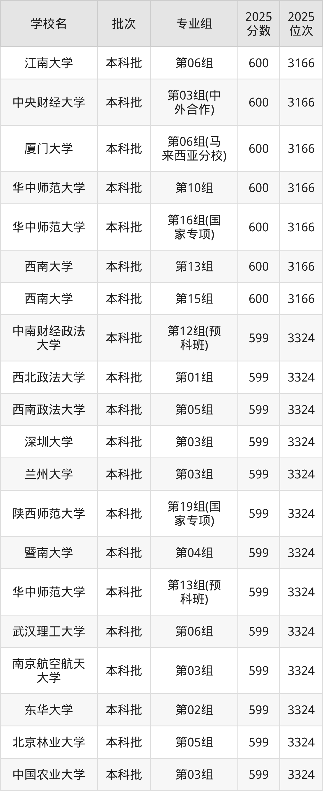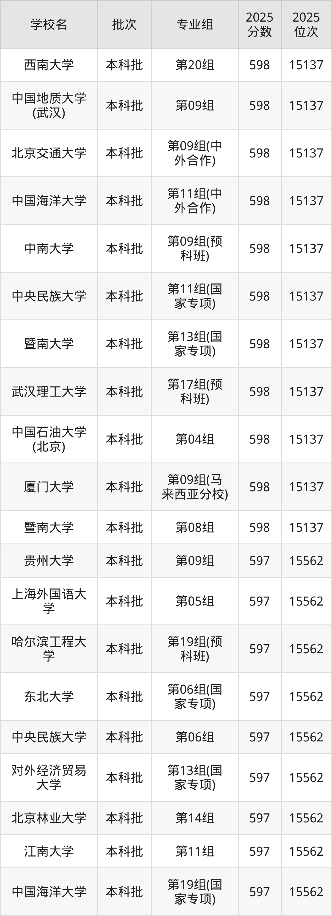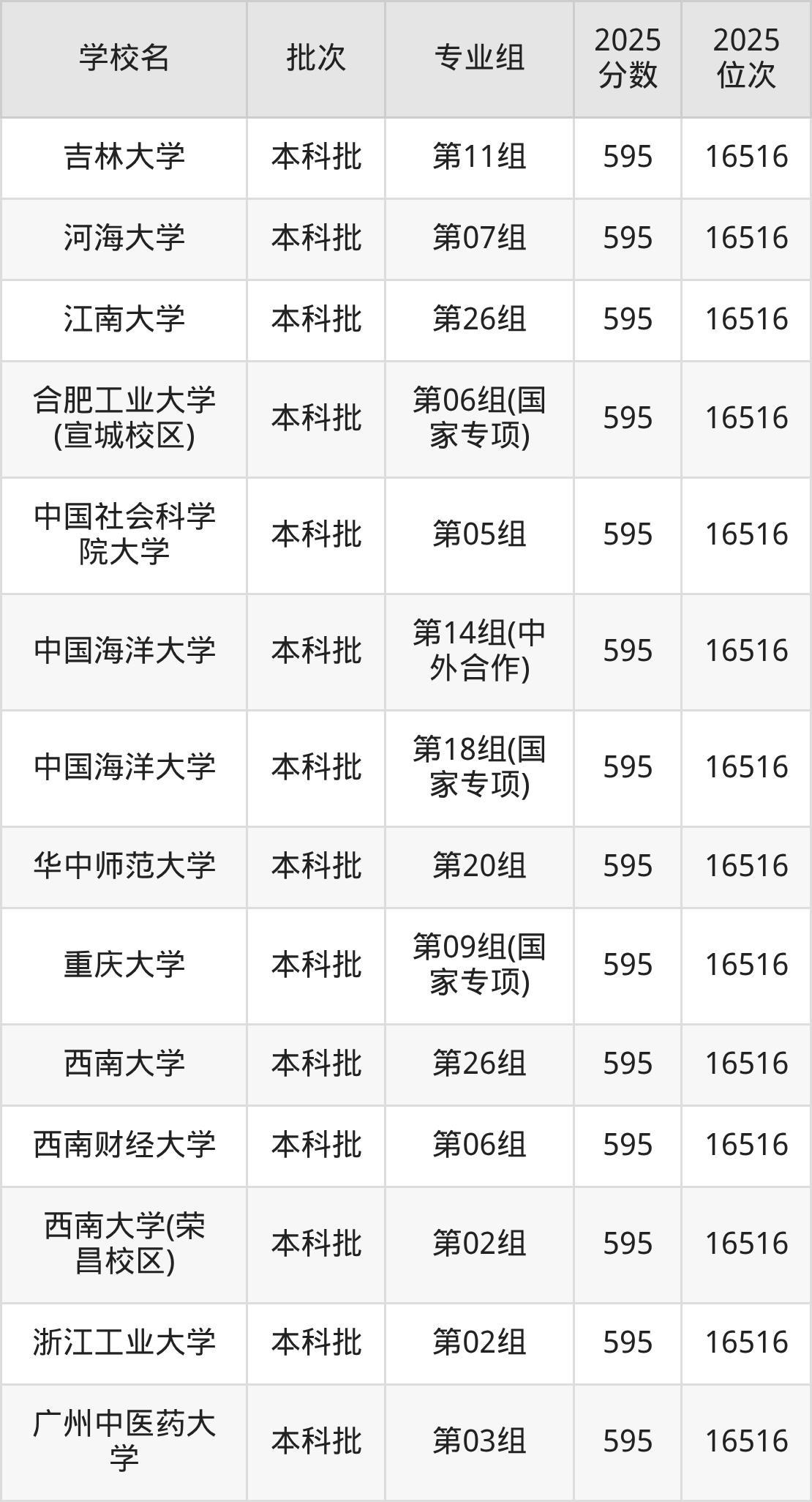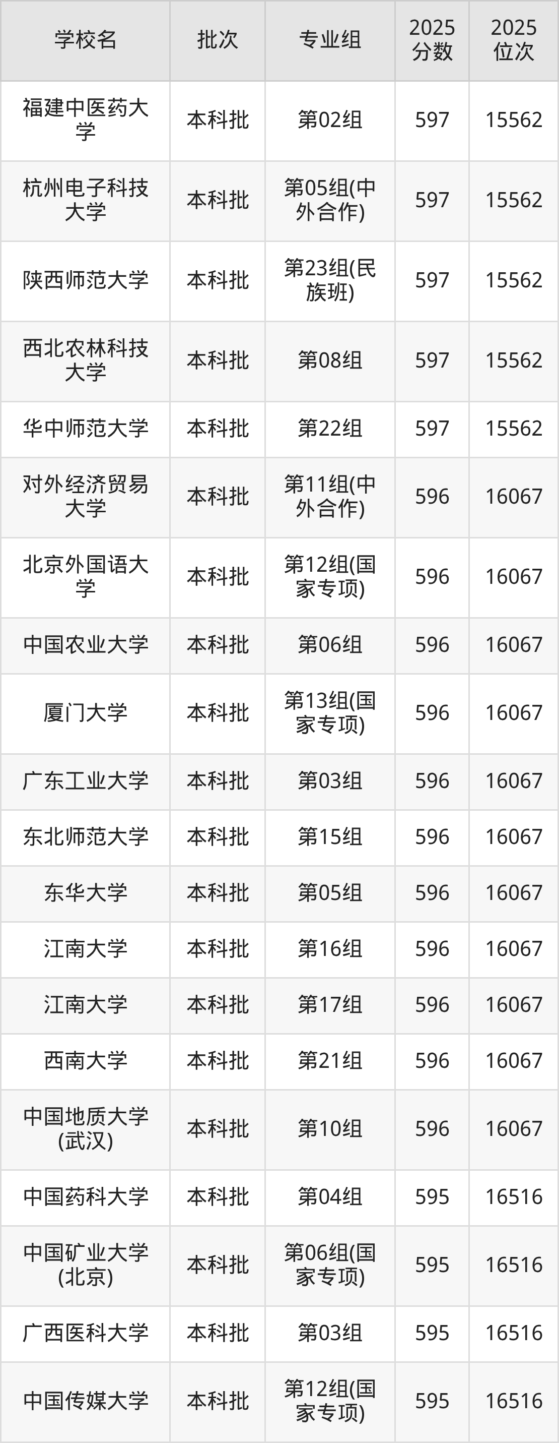 2025年湖北高考物理类596分(15563名~16067名)能上的大学有中国农业大学第06组、北京外国语大学第12组(国家专项)、对外经济贸易大学第11组(中外合作)、东北师范大学第15组等。