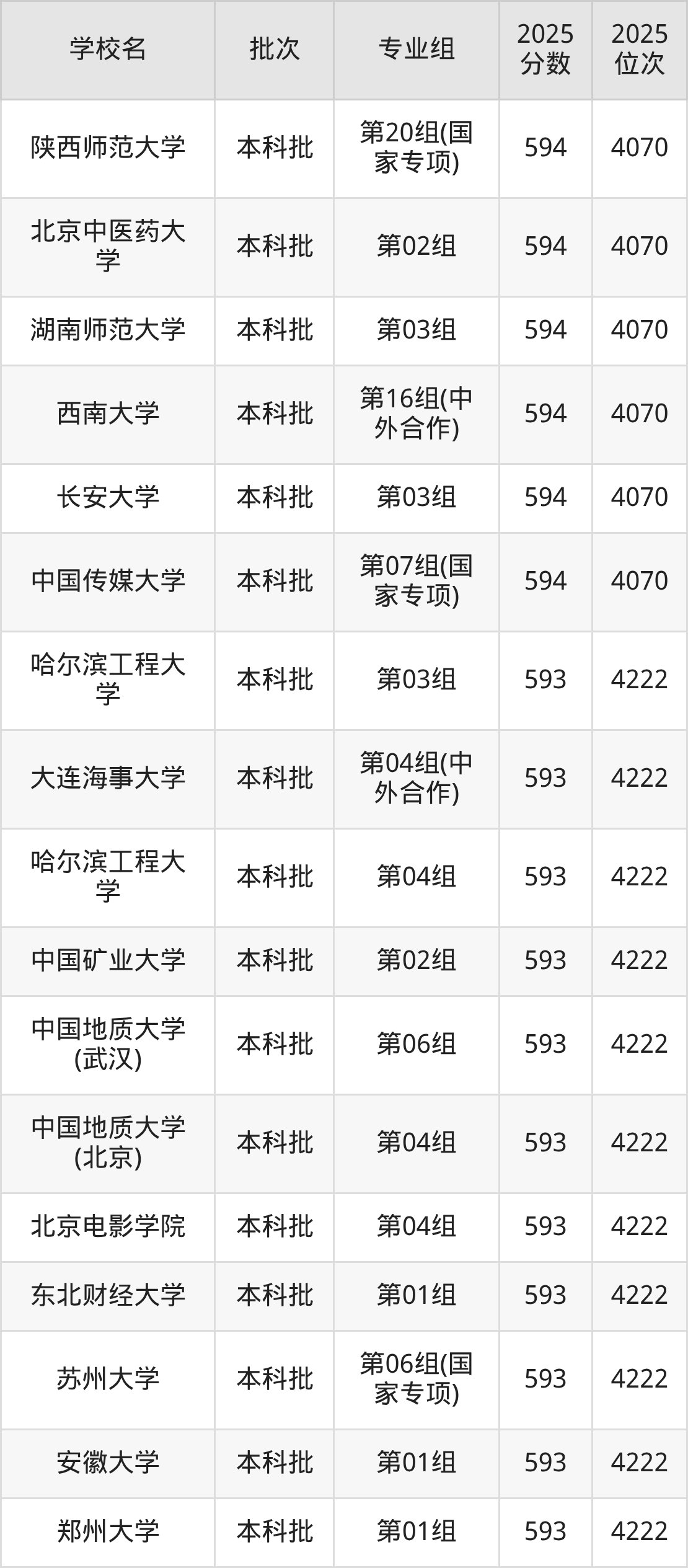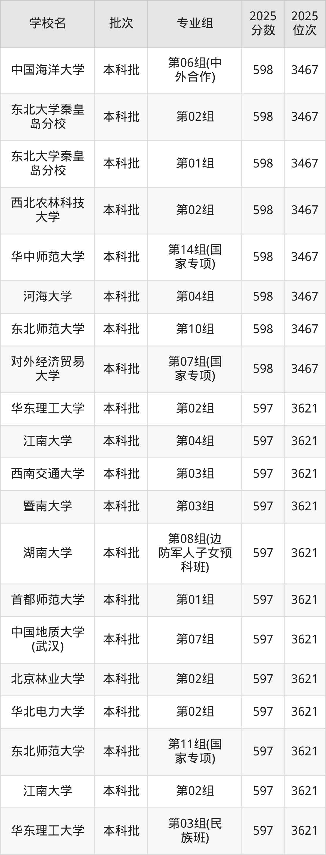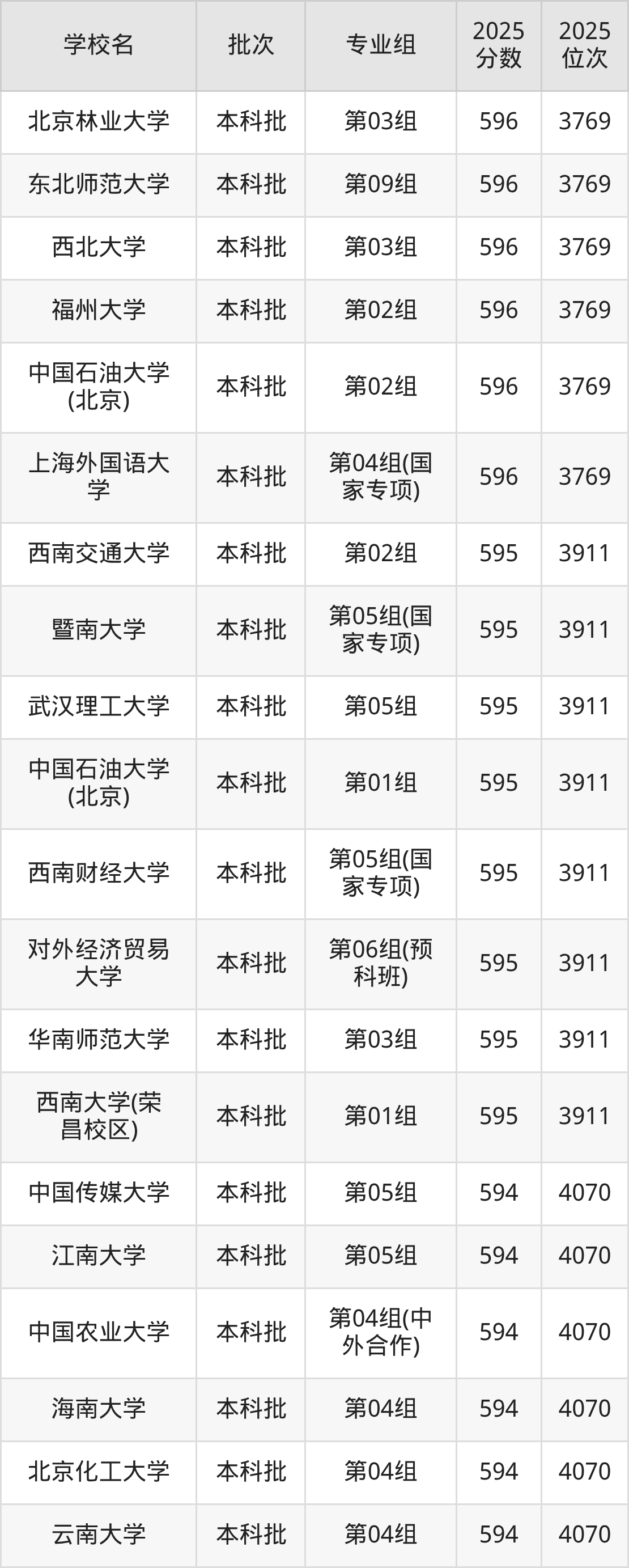 2025年湖北高考历史类596分(3622名~3769名)能上的大学有北京林业大学第03组、东北师范大学第09组、上海外国语大学第04组(国家专项)、中国石油大学(北京)第02组等。