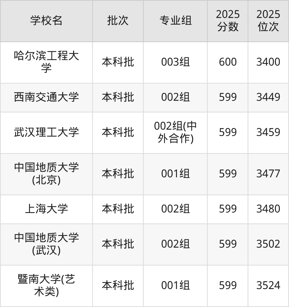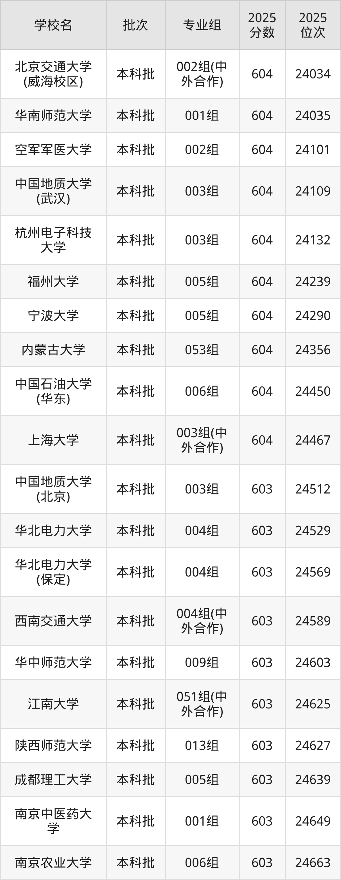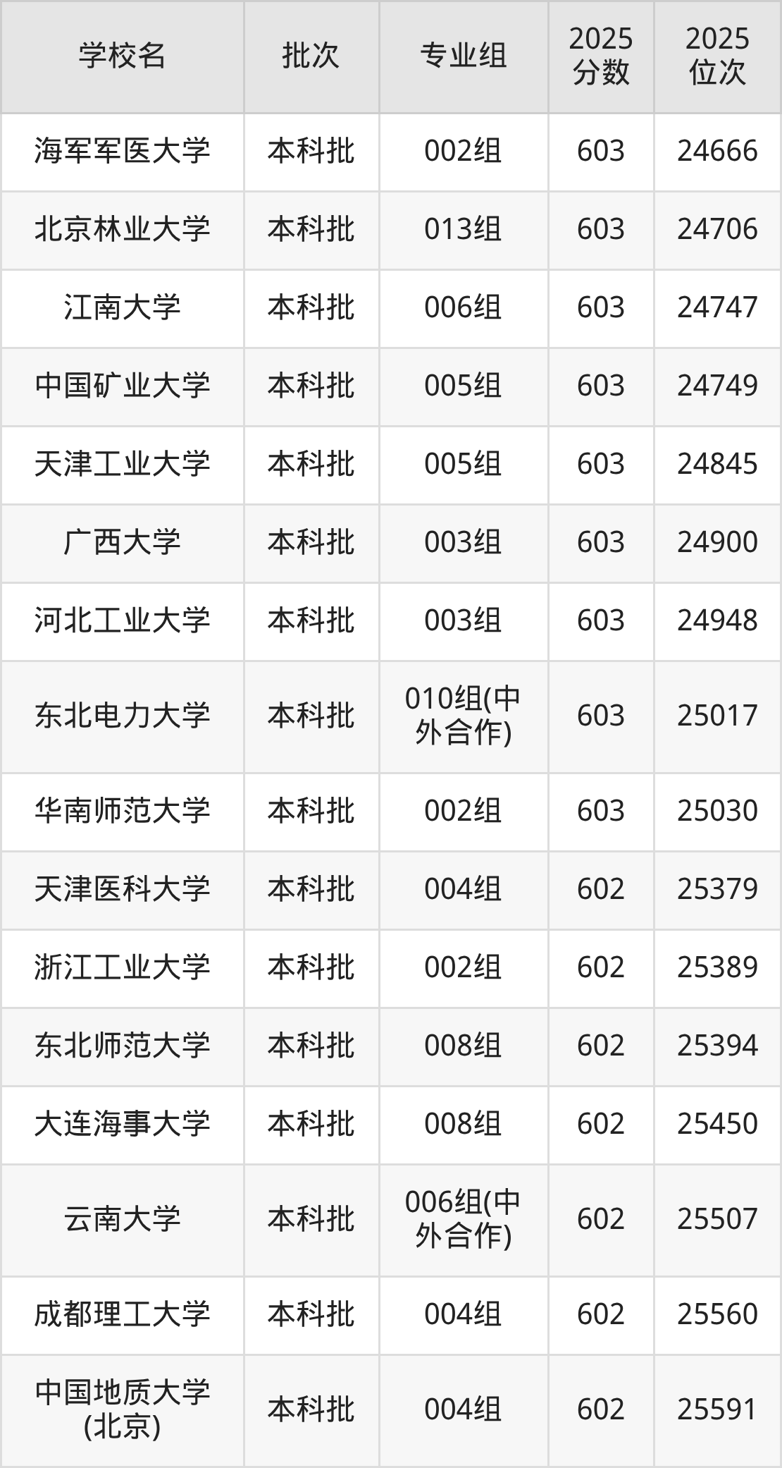 2025年安徽高考物理类603分(24504名~25101名)能上的大学有北京林业大学013组、成都理工大学005组、东北电力大学010组(中外合作)、广西大学003组等。