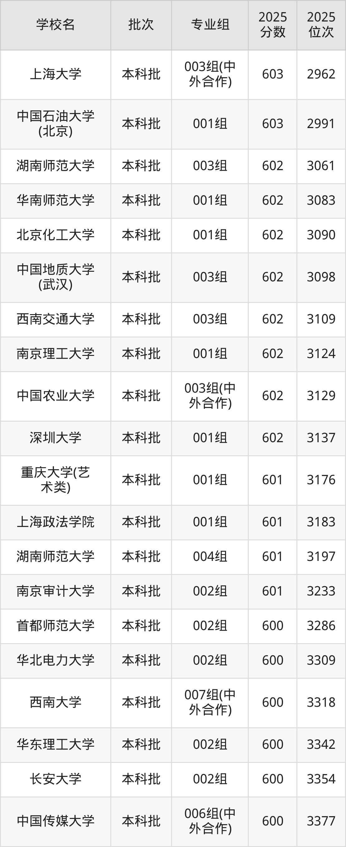 2025年安徽高考历史类603分(2918名~3034名)能上的大学有北京外国语大学006组(中外合作)、上海大学003组(中外合作)、中国石油大学(北京)001组。