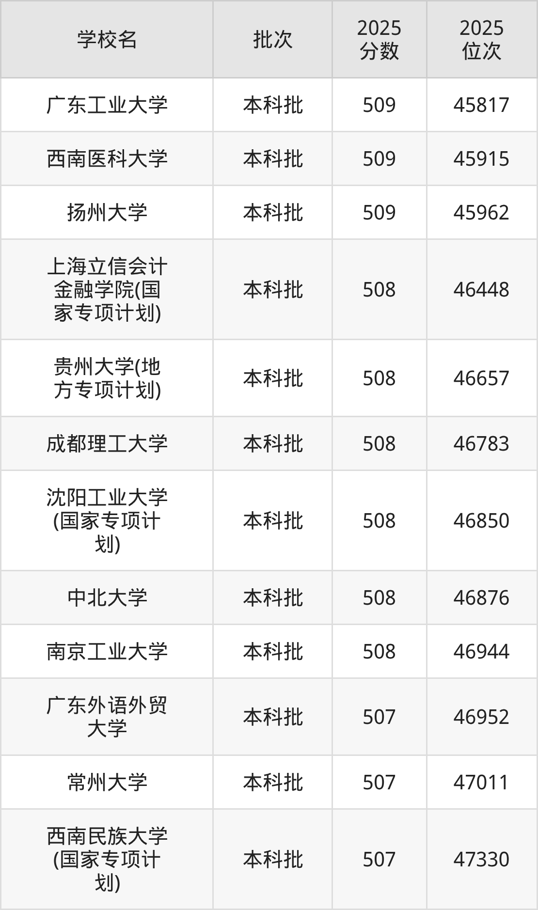 二、贵州508分位次排名能上的大学