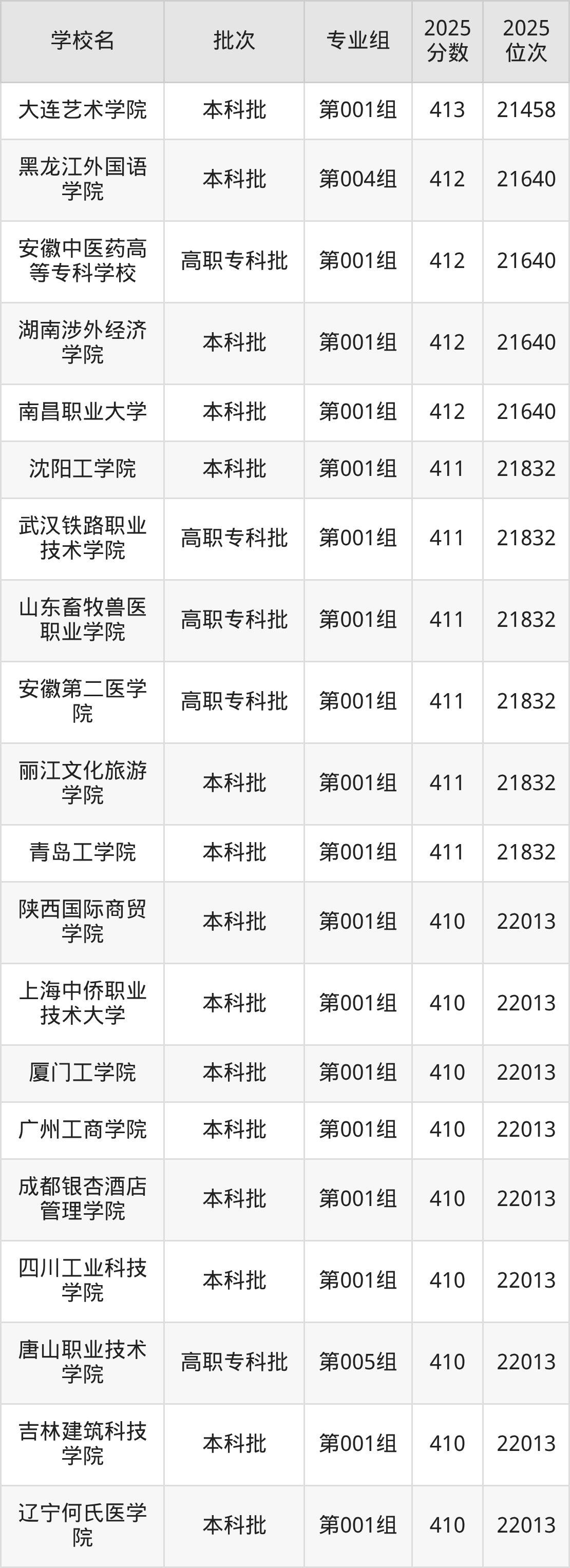 2025年黑龙江高考历史类412分(21459名~21640名)能上的大学有黑龙江外国语学院第004组、南昌职业大学第001组、湖南涉外经济学院第001组、安徽中医药高等专科学校第001组。